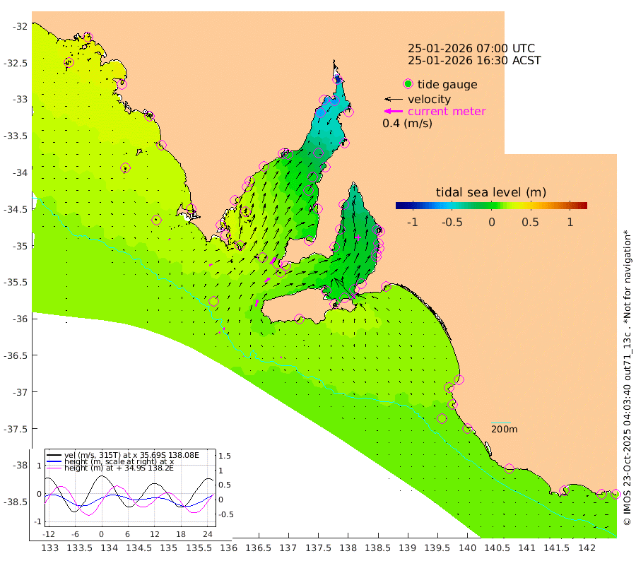 0cm/s 37T +10cm/s rms + 5cm/s 114T. SAM1DS 520m 6cm/s 53T +13cm/s rms + 5cm/s -36T. SAM2CP 100m 5cm/s 59T +21cm/s rms + 18cm/s 142T. SAM3MS 168m 3cm/s 97T +22cm/s rms + 0cm/s -30T. SAM4CY 117m 2cm/s -34T +23cm/s rms + 2cm/s 99T. SAM5CB 94m 13cm/s 52T +8cm/s rms + 3cm/s -172T. SAM6IS 83m 3cm/s 56T +11cm/s rms + 7cm/s 150T. SAM7DS 519m 18cm/s 40T +10cm/s rms + 2cm/s 87T. SAM8SG 47m 14cm/s 18T +20cm/s rms + 12cm/s -168T. NRSKAI 101m 17cm Warrnambool 16cm Port Fairy 17cm Portland 19cm Port Macdonnell 18cm Beachport 18cm Cape Rabelais (off) 19cm Robe 17cm Cape Jaffa 19cm Kingston 19cm Victor Harbor 20cm Vivonne Bay -3cm Kingscote -5cm American River 10cm Penneshaw -2cm Cape Jervis -14cm Second Valley -14cm Port Noarlunga -14cm Port Stanvac -18cm Brighton -14cm Glenelg -21cm Port Adelaide (Outer Harbor) -38cm Angus Inlet (Garden Island) -21cm Ardrossan -8cm Port Vincent -2cm Port Giles 22cm Stenhouse Bay 16cm Althorpe Island 18cm Pondalowie Bay 14cm Point Turton 14cm Port Victoria 5cm Cape Elizabeth 4cm Tiparra Reef Light -18cm Wallaroo -22cm Middle Bank -31cm Port Broughton -77cm Port Pirie -97cm Red Cliff Point (Beacon 5) -66cm Port Bonython -69cm Whyalla -61cm Western Shoal Beacon -18cm Franklin Harbor 6cm Franklin Harbor Entrance Beacon 19cm Arno Bay 27cm Port Neill 24cm Cape Hardy 26cm Tumby Bay 27cm Reevesby Island 33cm Port Lincoln 29cm Taylors Landing 17cm Whalers Bay 22cm Wedge Island Mooring 19cm Shelf Edge Mooring 26cm Coffin Bay Entrance Beacon 23cm Greenly Island 27cm Elliston 29cm Pearson Island 22cm Venus Bay 40cm Blanche Port (Streaky Bay) 40cm Thevenard 33cm St Francis Island
