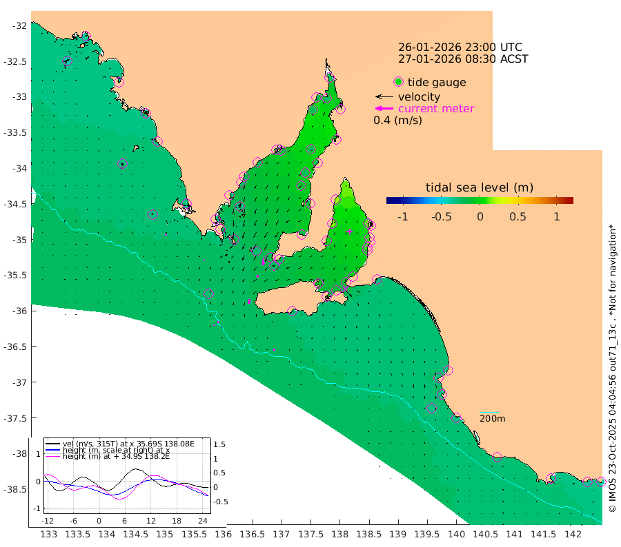 0cm/s 94T +10cm/s rms + 5cm/s 114T. SAM1DS 520m 2cm/s -159T +13cm/s rms + 5cm/s -36T. SAM2CP 100m 4cm/s 147T +21cm/s rms + 18cm/s 142T. SAM3MS 168m 5cm/s 168T +22cm/s rms + 0cm/s -30T. SAM4CY 117m 2cm/s 162T +23cm/s rms + 2cm/s 99T. SAM5CB 94m 6cm/s -144T +8cm/s rms + 3cm/s -172T. SAM6IS 83m 2cm/s 149T +11cm/s rms + 7cm/s 150T. SAM7DS 519m 17cm/s -176T +10cm/s rms + 2cm/s 87T. SAM8SG 47m 11cm/s -171T +20cm/s rms + 12cm/s -168T. NRSKAI 101m -36cm Warrnambool -34cm Port Fairy -34cm Portland -29cm Port Macdonnell -31cm Beachport -32cm Cape Rabelais (off) -31cm Robe -30cm Cape Jaffa -31cm Kingston -32cm Victor Harbor -30cm Vivonne Bay -6cm Kingscote -7cm American River -15cm Penneshaw -10cm Cape Jervis 1cm Second Valley 7cm Port Noarlunga 8cm Port Stanvac 12cm Brighton 11cm Glenelg 14cm Port Adelaide (Outer Harbor) 14cm Angus Inlet (Garden Island) 20cm Ardrossan 17cm Port Vincent 7cm Port Giles -20cm Stenhouse Bay -23cm Althorpe Island -20cm Pondalowie Bay -19cm Point Turton -17cm Port Victoria -15cm Cape Elizabeth -25cm Tiparra Reef Light -23cm Wallaroo -23cm Middle Bank -3cm Port Broughton -28cm Port Pirie -24cm Red Cliff Point (Beacon 5) -26cm Port Bonython -25cm Whyalla -26cm Western Shoal Beacon -11cm Franklin Harbor -22cm Franklin Harbor Entrance Beacon -24cm Arno Bay -26cm Port Neill -27cm Cape Hardy -27cm Tumby Bay -32cm Reevesby Island -30cm Port Lincoln -29cm Taylors Landing -21cm Whalers Bay -26cm Wedge Island Mooring -29cm Shelf Edge Mooring -32cm Coffin Bay Entrance Beacon -30cm Greenly Island -30cm Elliston -31cm Pearson Island -24cm Venus Bay -37cm Blanche Port (Streaky Bay) -37cm Thevenard -44cm St Francis Island