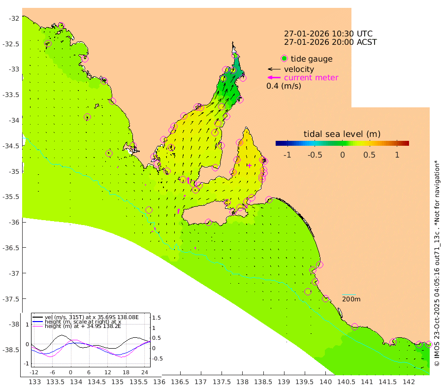 0cm/s 101T +10cm/s rms + 5cm/s 114T. SAM1DS 520m 3cm/s -47T +13cm/s rms + 5cm/s -36T. SAM2CP 100m 6cm/s -16T +21cm/s rms + 18cm/s 142T. SAM3MS 168m 5cm/s -7T +22cm/s rms + 0cm/s -30T. SAM4CY 117m 2cm/s -69T +23cm/s rms + 2cm/s 99T. SAM5CB 94m 5cm/s 18T +8cm/s rms + 3cm/s -172T. SAM6IS 83m 3cm/s -12T +11cm/s rms + 7cm/s 150T. SAM7DS 519m 21cm/s 1T +10cm/s rms + 2cm/s 87T. SAM8SG 47m 15cm/s 9T +20cm/s rms + 12cm/s -168T. NRSKAI 101m 15cm Warrnambool 14cm Port Fairy 17cm Portland 17cm Port Macdonnell 20cm Beachport 20cm Cape Rabelais (off) 19cm Robe 18cm Cape Jaffa 16cm Kingston 24cm Victor Harbor 22cm Vivonne Bay 42cm Kingscote 41cm American River 41cm Penneshaw 38cm Cape Jervis 44cm Second Valley 51cm Port Noarlunga 54cm Port Stanvac 55cm Brighton 55cm Glenelg 59cm Port Adelaide (Outer Harbor) 53cm Angus Inlet (Garden Island) 69cm Ardrossan 64cm Port Vincent 57cm Port Giles 30cm Stenhouse Bay 30cm Althorpe Island 25cm Pondalowie Bay 33cm Point Turton 33cm Port Victoria 34cm Cape Elizabeth 38cm Tiparra Reef Light 34cm Wallaroo 39cm Middle Bank -8cm Port Broughton 17cm Port Pirie 14cm Red Cliff Point (Beacon 5) 29cm Port Bonython 31cm Whyalla 31cm Western Shoal Beacon 31cm Franklin Harbor 46cm Franklin Harbor Entrance Beacon 47cm Arno Bay 47cm Port Neill 43cm Cape Hardy 41cm Tumby Bay 40cm Reevesby Island 38cm Port Lincoln 32cm Taylors Landing 34cm Whalers Bay 30cm Wedge Island Mooring 24cm Shelf Edge Mooring 23cm Coffin Bay Entrance Beacon 21cm Greenly Island 22cm Elliston 22cm Pearson Island 18cm Venus Bay 23cm Blanche Port (Streaky Bay) 22cm Thevenard 19cm St Francis Island