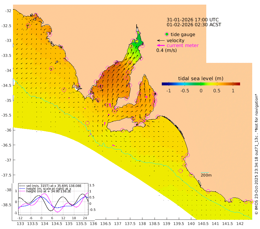 2cm/s -73T +10cm/s rms + 5cm/s 114T. SAM1DS 520m 4cm/s -91T +13cm/s rms + 5cm/s -36T. SAM2CP 100m 7cm/s -52T +21cm/s rms + 18cm/s 142T. SAM3MS 168m 13cm/s -69T +22cm/s rms + 0cm/s -30T. SAM4CY 117m 3cm/s -117T +23cm/s rms + 2cm/s 99T. SAM5CB 94m 8cm/s 40T +8cm/s rms + 3cm/s -172T. SAM6IS 83m 2cm/s -53T +11cm/s rms + 7cm/s 150T. SAM7DS 519m 23cm/s -7T +10cm/s rms + 2cm/s 87T. SAM8SG 47m 16cm/s 7T +20cm/s rms + 12cm/s -168T. NRSKAI 101m 40cm Warrnambool 40cm Port Fairy 41cm Portland 46cm Port Macdonnell 40cm Beachport 43cm Cape Rabelais (off) 43cm Robe 51cm Cape Jaffa 47cm Kingston 50cm Victor Harbor 37cm Vivonne Bay 66cm Kingscote 59cm American River 63cm Penneshaw 57cm Cape Jervis 60cm Second Valley 68cm Port Noarlunga 69cm Port Stanvac 68cm Brighton 72cm Glenelg 71cm Port Adelaide (Outer Harbor) 51cm Angus Inlet (Garden Island) 80cm Ardrossan 88cm Port Vincent 77cm Port Giles 57cm Stenhouse Bay 61cm Althorpe Island 53cm Pondalowie Bay 76cm Point Turton 77cm Port Victoria 78cm Cape Elizabeth 75cm Tiparra Reef Light 69cm Wallaroo 71cm Middle Bank 26cm Port Broughton 24cm Port Pirie 16cm Red Cliff Point (Beacon 5) 29cm Port Bonython 40cm Whyalla 47cm Western Shoal Beacon 73cm Franklin Harbor 92cm Franklin Harbor Entrance Beacon 89cm Arno Bay 95cm Port Neill 89cm Cape Hardy 87cm Tumby Bay 82cm Reevesby Island 77cm Port Lincoln 64cm Taylors Landing 72cm Whalers Bay 63cm Wedge Island Mooring 44cm Shelf Edge Mooring 58cm Coffin Bay Entrance Beacon 45cm Greenly Island 57cm Elliston 50cm Pearson Island 52cm Venus Bay 76cm Blanche Port (Streaky Bay) 72cm Thevenard 56cm St Francis Island