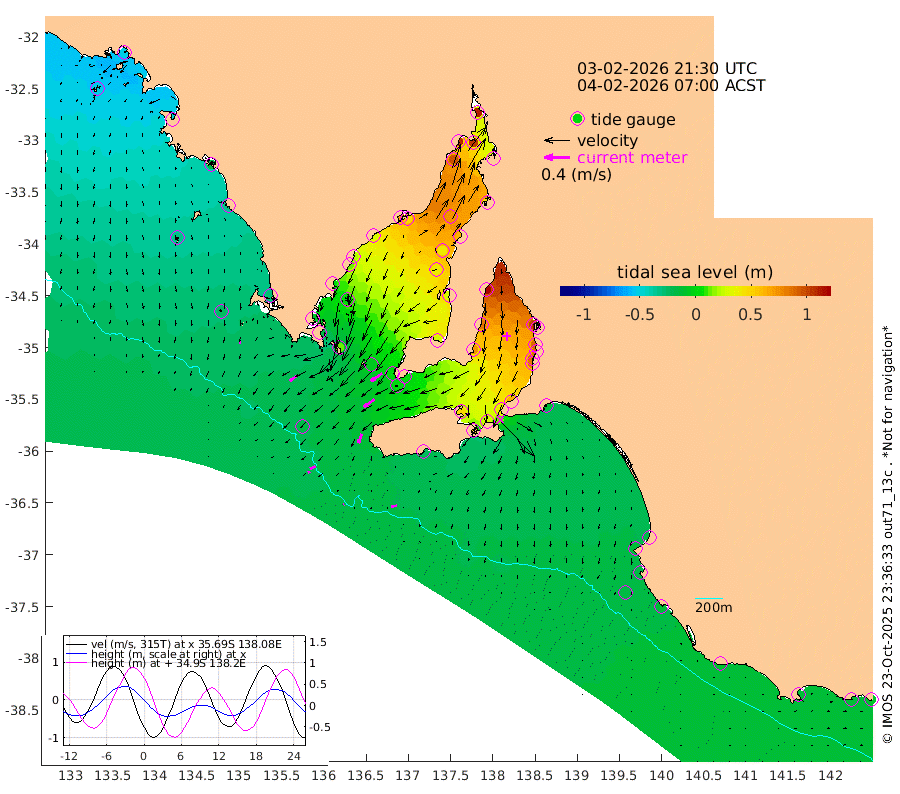 1cm/s -99T +10cm/s rms + 5cm/s 114T. SAM1DS 520m 12cm/s -125T +13cm/s rms + 5cm/s -36T. SAM2CP 100m 9cm/s -113T +21cm/s rms + 18cm/s 142T. SAM3MS 168m 9cm/s -98T +22cm/s rms + 0cm/s -30T. SAM4CY 117m 6cm/s -175T +23cm/s rms + 2cm/s 99T. SAM5CB 94m 20cm/s -126T +8cm/s rms + 3cm/s -172T. SAM6IS 83m 3cm/s -125T +11cm/s rms + 7cm/s 150T. SAM7DS 519m 21cm/s -124T +10cm/s rms + 2cm/s 87T. SAM8SG 47m 15cm/s -161T +20cm/s rms + 12cm/s -168T. NRSKAI 101m -11cm Warrnambool -11cm Port Fairy -13cm Portland -9cm Port Macdonnell -15cm Beachport -16cm Cape Rabelais (off) -15cm Robe -14cm Cape Jaffa -16cm Kingston -14cm Victor Harbor -23cm Vivonne Bay 47cm Kingscote 44cm American River 26cm Penneshaw 39cm Cape Jervis 64cm Second Valley 81cm Port Noarlunga 85cm Port Stanvac 88cm Brighton 89cm Glenelg 101cm Port Adelaide (Outer Harbor) 118cm Angus Inlet (Garden Island) 117cm Ardrossan 84cm Port Vincent 74cm Port Giles 0cm Stenhouse Bay 2cm Althorpe Island 0cm Pondalowie Bay 27cm Point Turton 30cm Port Victoria 38cm Cape Elizabeth 40cm Tiparra Reef Light 62cm Wallaroo 71cm Middle Bank 45cm Port Broughton 100cm Port Pirie 111cm Red Cliff Point (Beacon 5) 105cm Port Bonython 108cm Whyalla 96cm Western Shoal Beacon 68cm Franklin Harbor 46cm Franklin Harbor Entrance Beacon 28cm Arno Bay 19cm Port Neill 11cm Cape Hardy 3cm Tumby Bay 1cm Reevesby Island -9cm Port Lincoln -16cm Taylors Landing 12cm Whalers Bay -5cm Wedge Island Mooring -17cm Shelf Edge Mooring -26cm Coffin Bay Entrance Beacon -25cm Greenly Island -30cm Elliston -33cm Pearson Island -19cm Venus Bay -47cm Blanche Port (Streaky Bay) -49cm Thevenard -52cm St Francis Island