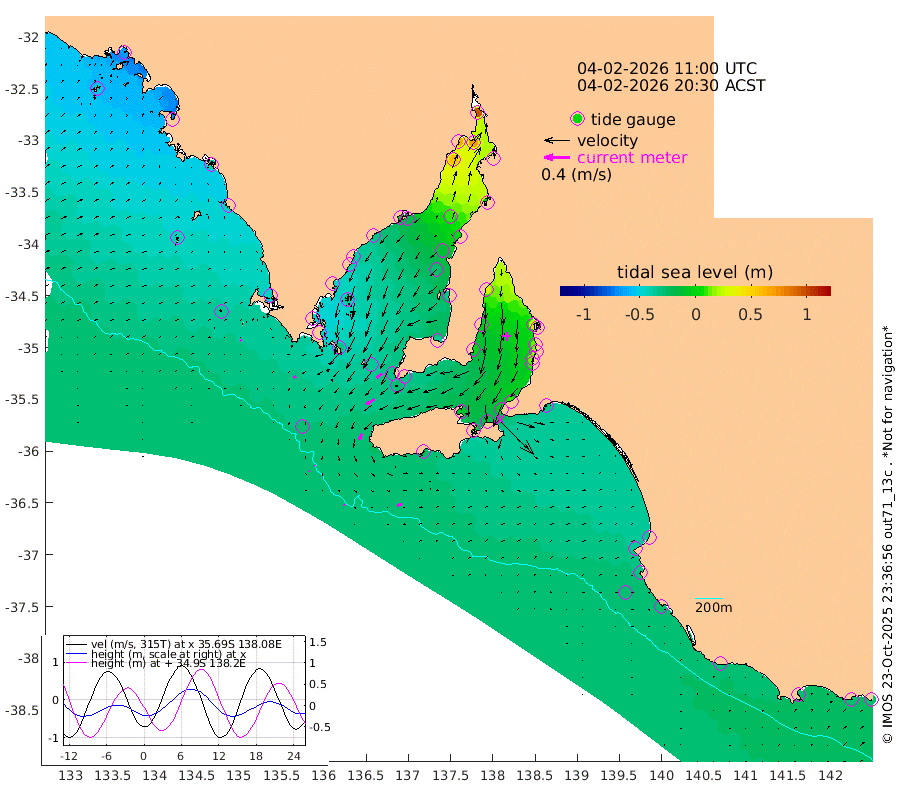1cm/s 143T +10cm/s rms + 5cm/s 114T. SAM1DS 520m 4cm/s -122T +13cm/s rms + 5cm/s -36T. SAM2CP 100m 2cm/s -55T +21cm/s rms + 18cm/s 142T. SAM3MS 168m 7cm/s 68T +22cm/s rms + 0cm/s -30T. SAM4CY 117m 2cm/s 119T +23cm/s rms + 2cm/s 99T. SAM5CB 94m 15cm/s -121T +8cm/s rms + 3cm/s -172T. SAM6IS 83m 2cm/s -57T +11cm/s rms + 7cm/s 150T. SAM7DS 519m 11cm/s -129T +10cm/s rms + 2cm/s 87T. SAM8SG 47m 10cm/s -161T +20cm/s rms + 12cm/s -168T. NRSKAI 101m -27cm Warrnambool -28cm Port Fairy -27cm Portland -34cm Port Macdonnell -27cm Beachport -29cm Cape Rabelais (off) -30cm Robe -36cm Cape Jaffa -34cm Kingston -30cm Victor Harbor -25cm Vivonne Bay -8cm Kingscote -3cm American River -16cm Penneshaw -2cm Cape Jervis 8cm Second Valley 11cm Port Noarlunga 13cm Port Stanvac 16cm Brighton 14cm Glenelg 22cm Port Adelaide (Outer Harbor) 49cm Angus Inlet (Garden Island) 27cm Ardrossan -5cm Port Vincent -1cm Port Giles -33cm Stenhouse Bay -29cm Althorpe Island -32cm Pondalowie Bay -35cm Point Turton -34cm Port Victoria -29cm Cape Elizabeth -14cm Tiparra Reef Light 4cm Wallaroo 11cm Middle Bank -3cm Port Broughton 71cm Port Pirie 95cm Red Cliff Point (Beacon 5) 68cm Port Bonython 66cm Whyalla 58cm Western Shoal Beacon -6cm Franklin Harbor -22cm Franklin Harbor Entrance Beacon -31cm Arno Bay -41cm Port Neill -39cm Cape Hardy -43cm Tumby Bay -39cm Reevesby Island -46cm Port Lincoln -42cm Taylors Landing -33cm Whalers Bay -36cm Wedge Island Mooring -29cm Shelf Edge Mooring -43cm Coffin Bay Entrance Beacon -34cm Greenly Island -45cm Elliston -43cm Pearson Island -39cm Venus Bay -69cm Blanche Port (Streaky Bay) -65cm Thevenard -50cm St Francis Island
