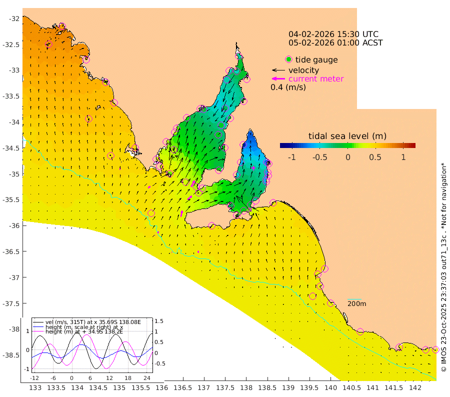 1cm/s -60T +10cm/s rms + 5cm/s 114T. SAM1DS 520m 9cm/s 49T +13cm/s rms + 5cm/s -36T. SAM2CP 100m 5cm/s 32T +21cm/s rms + 18cm/s 142T. SAM3MS 168m 6cm/s -11T +22cm/s rms + 0cm/s -30T. SAM4CY 117m 5cm/s 0T +23cm/s rms + 2cm/s 99T. SAM5CB 94m 18cm/s 52T +8cm/s rms + 3cm/s -172T. SAM6IS 83m 2cm/s 7T +11cm/s rms + 7cm/s 150T. SAM7DS 519m 21cm/s 30T +10cm/s rms + 2cm/s 87T. SAM8SG 47m 19cm/s 12T +20cm/s rms + 12cm/s -168T. NRSKAI 101m 39cm Warrnambool 37cm Port Fairy 38cm Portland 35cm Port Macdonnell 37cm Beachport 40cm Cape Rabelais (off) 38cm Robe 41cm Cape Jaffa 42cm Kingston 39cm Victor Harbor 40cm Vivonne Bay -22cm Kingscote -19cm American River -4cm Penneshaw -17cm Cape Jervis -38cm Second Valley -58cm Port Noarlunga -61cm Port Stanvac -64cm Brighton -65cm Glenelg -78cm Port Adelaide (Outer Harbor) -92cm Angus Inlet (Garden Island) -97cm Ardrossan -63cm Port Vincent -52cm Port Giles 19cm Stenhouse Bay 23cm Althorpe Island 21cm Pondalowie Bay 4cm Point Turton -1cm Port Victoria -2cm Cape Elizabeth -5cm Tiparra Reef Light -19cm Wallaroo -24cm Middle Bank -7cm Port Broughton -37cm Port Pirie -40cm Red Cliff Point (Beacon 5) -44cm Port Bonython -46cm Whyalla -40cm Western Shoal Beacon -26cm Franklin Harbor -7cm Franklin Harbor Entrance Beacon 4cm Arno Bay 15cm Port Neill 19cm Cape Hardy 26cm Tumby Bay 23cm Reevesby Island 32cm Port Lincoln 38cm Taylors Landing 12cm Whalers Bay 29cm Wedge Island Mooring 38cm Shelf Edge Mooring 48cm Coffin Bay Entrance Beacon 43cm Greenly Island 51cm Elliston 50cm Pearson Island 36cm Venus Bay 68cm Blanche Port (Streaky Bay) 67cm Thevenard 66cm St Francis Island