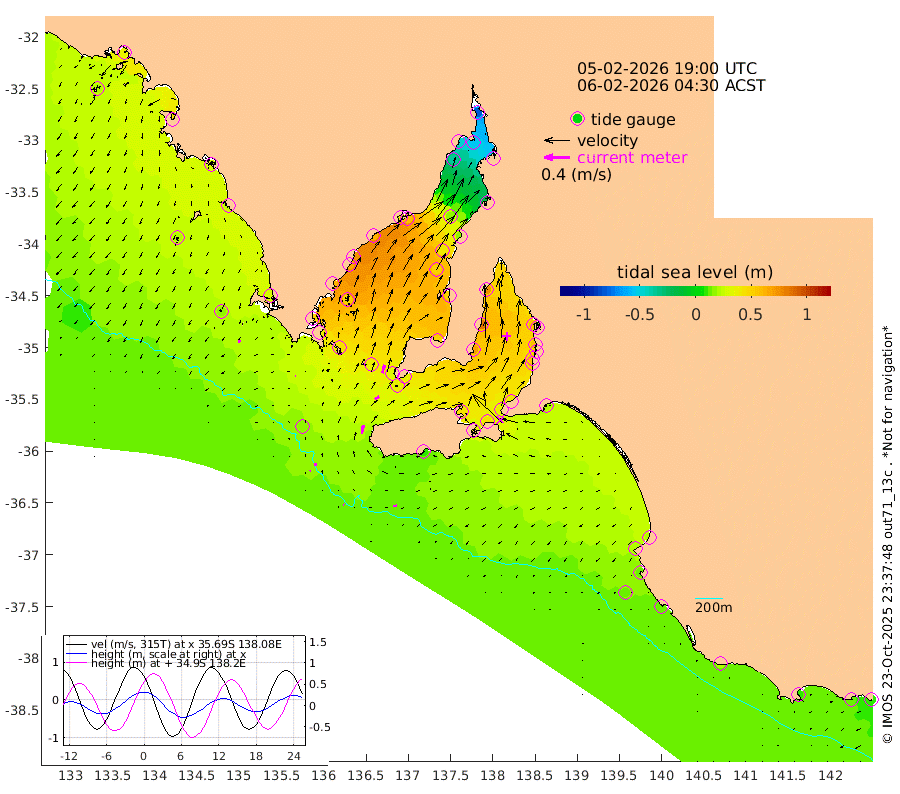 1cm/s -53T +10cm/s rms + 5cm/s 114T. SAM1DS 520m 1cm/s -80T +13cm/s rms + 5cm/s -36T. SAM2CP 100m 4cm/s 1T +21cm/s rms + 18cm/s 142T. SAM3MS 168m 6cm/s -93T +22cm/s rms + 0cm/s -30T. SAM4CY 117m 4cm/s -149T +23cm/s rms + 2cm/s 99T. SAM5CB 94m 8cm/s 59T +8cm/s rms + 3cm/s -172T. SAM6IS 83m 2cm/s 24T +11cm/s rms + 7cm/s 150T. SAM7DS 519m 13cm/s 15T +10cm/s rms + 2cm/s 87T. SAM8SG 47m 13cm/s 11T +20cm/s rms + 12cm/s -168T. NRSKAI 101m 11cm Warrnambool 12cm Port Fairy 11cm Portland 21cm Port Macdonnell 12cm Beachport 14cm Cape Rabelais (off) 15cm Robe 20cm Cape Jaffa 19cm Kingston 21cm Victor Harbor 11cm Vivonne Bay 44cm Kingscote 36cm American River 43cm Penneshaw 34cm Cape Jervis 40cm Second Valley 53cm Port Noarlunga 54cm Port Stanvac 52cm Brighton 57cm Glenelg 58cm Port Adelaide (Outer Harbor) 25cm Angus Inlet (Garden Island) 73cm Ardrossan 83cm Port Vincent 68cm Port Giles 37cm Stenhouse Bay 34cm Althorpe Island 31cm Pondalowie Bay 51cm Point Turton 50cm Port Victoria 52cm Cape Elizabeth 38cm Tiparra Reef Light 18cm Wallaroo 18cm Middle Bank -13cm Port Broughton -72cm Port Pirie -79cm Red Cliff Point (Beacon 5) -55cm Port Bonython -45cm Whyalla -34cm Western Shoal Beacon 36cm Franklin Harbor 58cm Franklin Harbor Entrance Beacon 61cm Arno Bay 72cm Port Neill 64cm Cape Hardy 62cm Tumby Bay 51cm Reevesby Island 52cm Port Lincoln 39cm Taylors Landing 45cm Whalers Bay 35cm Wedge Island Mooring 15cm Shelf Edge Mooring 26cm Coffin Bay Entrance Beacon 15cm Greenly Island 25cm Elliston 21cm Pearson Island 27cm Venus Bay 42cm Blanche Port (Streaky Bay) 36cm Thevenard 21cm St Francis Island