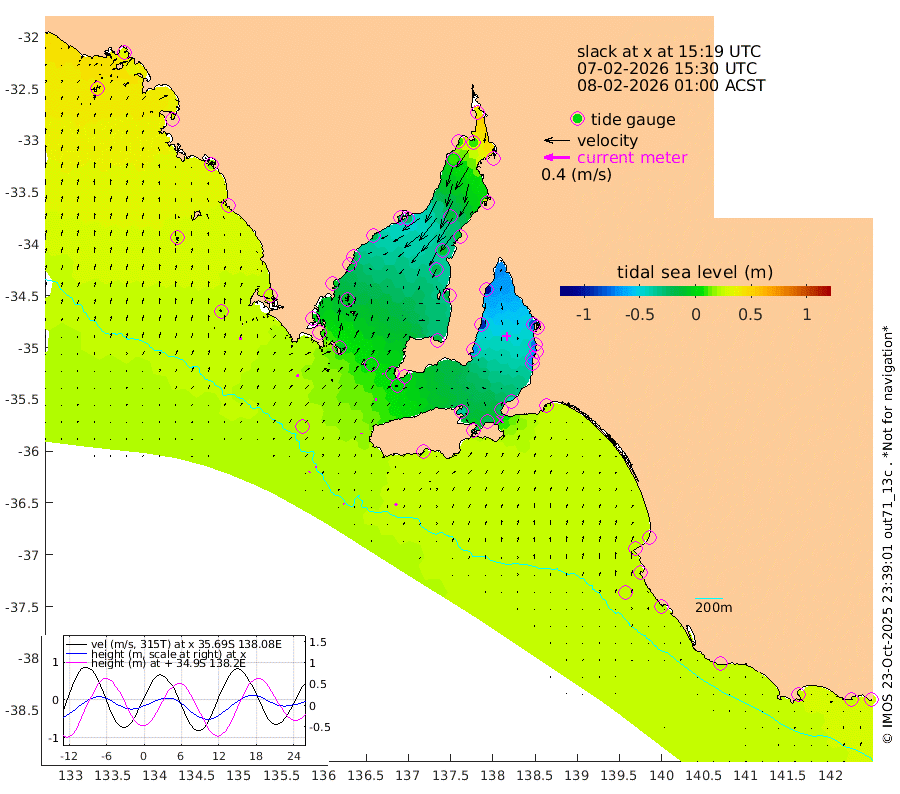 1cm/s -80T +10cm/s rms + 5cm/s 114T. SAM1DS 520m 4cm/s 67T +13cm/s rms + 5cm/s -36T. SAM2CP 100m 2cm/s 155T +21cm/s rms + 18cm/s 142T. SAM3MS 168m 4cm/s -42T +22cm/s rms + 0cm/s -30T. SAM4CY 117m 4cm/s 17T +23cm/s rms + 2cm/s 99T. SAM5CB 94m 2cm/s 90T +8cm/s rms + 3cm/s -172T. SAM6IS 83m 1cm/s -155T +11cm/s rms + 7cm/s 150T. SAM7DS 519m 2cm/s 117T +10cm/s rms + 2cm/s 87T. SAM8SG 47m 1cm/s 9T +20cm/s rms + 12cm/s -168T. NRSKAI 101m 28cm Warrnambool 25cm Port Fairy 25cm Portland 20cm Port Macdonnell 21cm Beachport 23cm Cape Rabelais (off) 23cm Robe 25cm Cape Jaffa 25cm Kingston 20cm Victor Harbor 21cm Vivonne Bay -36cm Kingscote -28cm American River -22cm Penneshaw -25cm Cape Jervis -43cm Second Valley -65cm Port Noarlunga -68cm Port Stanvac -69cm Brighton -71cm Glenelg -82cm Port Adelaide (Outer Harbor) -75cm Angus Inlet (Garden Island) -104cm Ardrossan -90cm Port Vincent -69cm Port Giles -2cm Stenhouse Bay 6cm Althorpe Island 3cm Pondalowie Bay -13cm Point Turton -16cm Port Victoria -19cm Cape Elizabeth -10cm Tiparra Reef Light -6cm Wallaroo -11cm Middle Bank 28cm Port Broughton 31cm Port Pirie 34cm Red Cliff Point (Beacon 5) 9cm Port Bonython 8cm Whyalla 10cm Western Shoal Beacon -23cm Franklin Harbor -25cm Franklin Harbor Entrance Beacon -21cm Arno Bay -19cm Port Neill -12cm Cape Hardy -7cm Tumby Bay -5cm Reevesby Island -1cm Port Lincoln 8cm Taylors Landing -5cm Whalers Bay 6cm Wedge Island Mooring 19cm Shelf Edge Mooring 23cm Coffin Bay Entrance Beacon 21cm Greenly Island 26cm Elliston 24cm Pearson Island 18cm Venus Bay 32cm Blanche Port (Streaky Bay) 33cm Thevenard 41cm St Francis Island