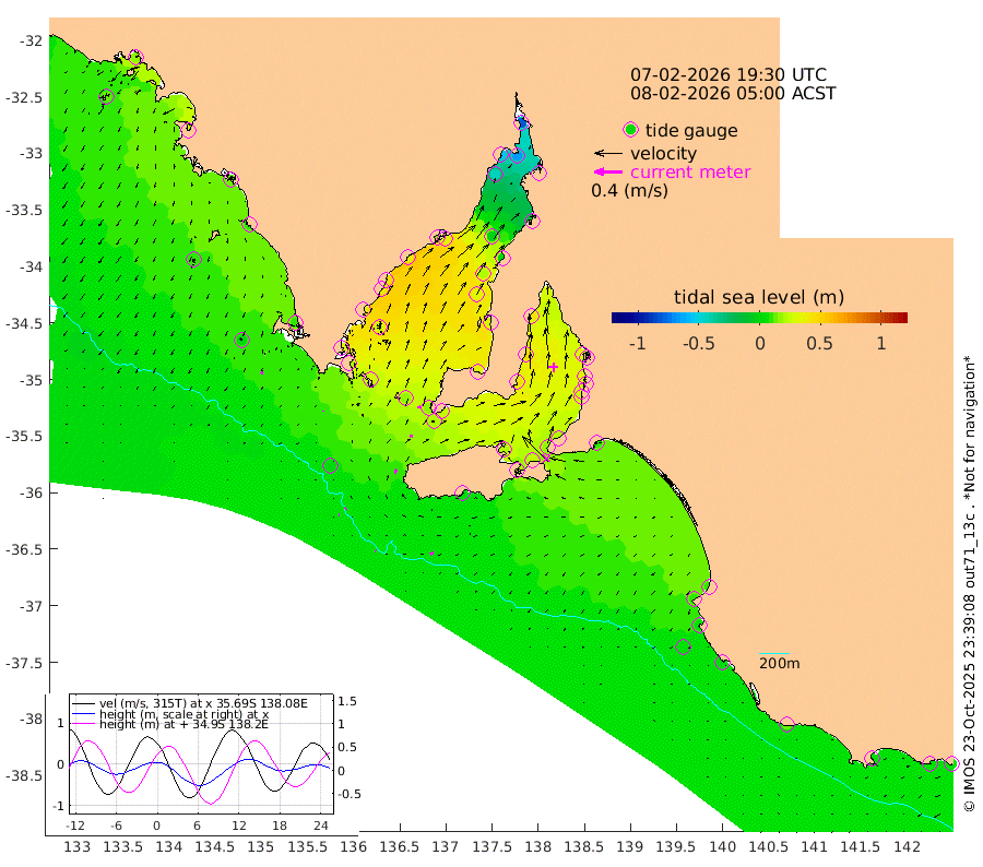 1cm/s -63T +10cm/s rms + 5cm/s 114T. SAM1DS 520m 1cm/s -164T +13cm/s rms + 5cm/s -36T. SAM2CP 100m 2cm/s 70T +21cm/s rms + 18cm/s 142T. SAM3MS 168m 5cm/s -121T +22cm/s rms + 0cm/s -30T. SAM4CY 117m 3cm/s -159T +23cm/s rms + 2cm/s 99T. SAM5CB 94m 5cm/s 88T +8cm/s rms + 3cm/s -172T. SAM6IS 83m 1cm/s 93T +11cm/s rms + 7cm/s 150T. SAM7DS 519m 4cm/s 73T +10cm/s rms + 2cm/s 87T. SAM8SG 47m 6cm/s 16T +20cm/s rms + 12cm/s -168T. NRSKAI 101m 4cm Warrnambool 4cm Port Fairy 3cm Portland 11cm Port Macdonnell 2cm Beachport 4cm Cape Rabelais (off) 6cm Robe 9cm Cape Jaffa 9cm Kingston 8cm Victor Harbor 1cm Vivonne Bay 22cm Kingscote 19cm American River 24cm Penneshaw 17cm Cape Jervis 21cm Second Valley 29cm Port Noarlunga 30cm Port Stanvac 29cm Brighton 32cm Glenelg 32cm Port Adelaide (Outer Harbor) 4cm Angus Inlet (Garden Island) 42cm Ardrossan 49cm Port Vincent 42cm Port Giles 23cm Stenhouse Bay 21cm Althorpe Island 17cm Pondalowie Bay 32cm Point Turton 30cm Port Victoria 30cm Cape Elizabeth 20cm Tiparra Reef Light 2cm Wallaroo -1cm Middle Bank -8cm Port Broughton -74cm Port Pirie -81cm Red Cliff Point (Beacon 5) -64cm Port Bonython -54cm Whyalla -43cm Western Shoal Beacon 17cm Franklin Harbor 31cm Franklin Harbor Entrance Beacon 35cm Arno Bay 45cm Port Neill 39cm Cape Hardy 38cm Tumby Bay 27cm Reevesby Island 30cm Port Lincoln 20cm Taylors Landing 27cm Whalers Bay 18cm Wedge Island Mooring 2cm Shelf Edge Mooring 11cm Coffin Bay Entrance Beacon 3cm Greenly Island 11cm Elliston 8cm Pearson Island 15cm Venus Bay 23cm Blanche Port (Streaky Bay) 18cm Thevenard 14cm St Francis Island