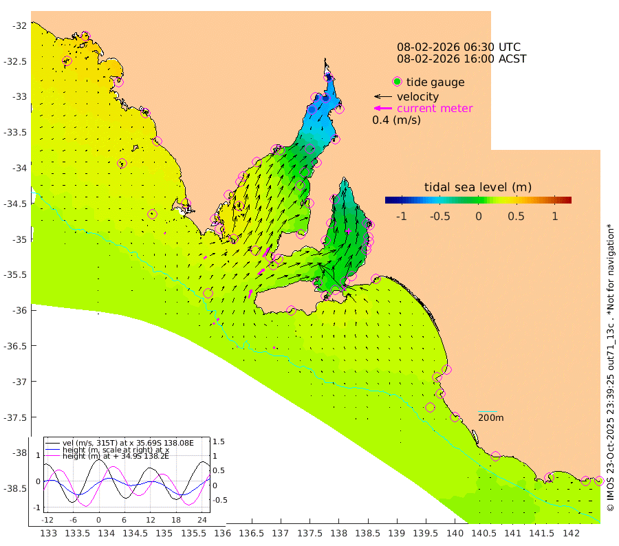 1cm/s 72T +10cm/s rms + 5cm/s 114T. SAM1DS 520m 8cm/s 50T +13cm/s rms + 5cm/s -36T. SAM2CP 100m 6cm/s 41T +21cm/s rms + 18cm/s 142T. SAM3MS 168m 4cm/s 81T +22cm/s rms + 0cm/s -30T. SAM4CY 117m 2cm/s -47T +23cm/s rms + 2cm/s 99T. SAM5CB 94m 19cm/s 51T +8cm/s rms + 3cm/s -172T. SAM6IS 83m 3cm/s 49T +11cm/s rms + 7cm/s 150T. SAM7DS 519m 24cm/s 36T +10cm/s rms + 2cm/s 87T. SAM8SG 47m 20cm/s 16T +20cm/s rms + 12cm/s -168T. NRSKAI 101m 22cm Warrnambool 22cm Port Fairy 22cm Portland 24cm Port Macdonnell 23cm Beachport 23cm Cape Rabelais (off) 24cm Robe 23cm Cape Jaffa 26cm Kingston 25cm Victor Harbor 26cm Vivonne Bay 0cm Kingscote -4cm American River 15cm Penneshaw -1cm Cape Jervis -13cm Second Valley -14cm Port Noarlunga -14cm Port Stanvac -19cm Brighton -15cm Glenelg -22cm Port Adelaide (Outer Harbor) -48cm Angus Inlet (Garden Island) -24cm Ardrossan -1cm Port Vincent 1cm Port Giles 28cm Stenhouse Bay 22cm Althorpe Island 23cm Pondalowie Bay 22cm Point Turton 21cm Port Victoria 14cm Cape Elizabeth 5cm Tiparra Reef Light -22cm Wallaroo -26cm Middle Bank -49cm Port Broughton -102cm Port Pirie -120cm Red Cliff Point (Beacon 5) -88cm Port Bonython -89cm Whyalla -78cm Western Shoal Beacon -11cm Franklin Harbor 17cm Franklin Harbor Entrance Beacon 29cm Arno Bay 40cm Port Neill 33cm Cape Hardy 37cm Tumby Bay 37cm Reevesby Island 44cm Port Lincoln 39cm Taylors Landing 24cm Whalers Bay 30cm Wedge Island Mooring 24cm Shelf Edge Mooring 35cm Coffin Bay Entrance Beacon 30cm Greenly Island 34cm Elliston 34cm Pearson Island 28cm Venus Bay 52cm Blanche Port (Streaky Bay) 52cm Thevenard 42cm St Francis Island