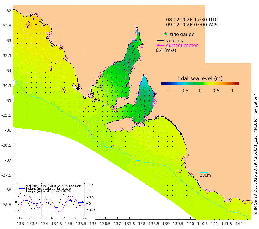 1cm/s -65T +10cm/s rms + 5cm/s 114T. SAM1DS 520m 3cm/s 77T +13cm/s rms + 5cm/s -36T. SAM2CP 100m 3cm/s 134T +21cm/s rms + 18cm/s 142T. SAM3MS 168m 5cm/s -86T +22cm/s rms + 0cm/s -30T. SAM4CY 117m 1cm/s 5T +23cm/s rms + 2cm/s 99T. SAM5CB 94m 6cm/s 88T +8cm/s rms + 3cm/s -172T. SAM6IS 83m 2cm/s 152T +11cm/s rms + 7cm/s 150T. SAM7DS 519m 4cm/s 109T +10cm/s rms + 2cm/s 87T. SAM8SG 47m 4cm/s 22T +20cm/s rms + 12cm/s -168T. NRSKAI 101m 28cm Warrnambool 26cm Port Fairy 25cm Portland 27cm Port Macdonnell 21cm Beachport 23cm Cape Rabelais (off) 25cm Robe 28cm Cape Jaffa 28cm Kingston 22cm Victor Harbor 19cm Vivonne Bay -18cm Kingscote -15cm American River -4cm Penneshaw -13cm Cape Jervis -26cm Second Valley -40cm Port Noarlunga -42cm Port Stanvac -44cm Brighton -44cm Glenelg -53cm Port Adelaide (Outer Harbor) -66cm Angus Inlet (Garden Island) -66cm Ardrossan -50cm Port Vincent -34cm Port Giles 15cm Stenhouse Bay 19cm Althorpe Island 15cm Pondalowie Bay 12cm Point Turton 9cm Port Victoria 4cm Cape Elizabeth 6cm Tiparra Reef Light -5cm Wallaroo -12cm Middle Bank 16cm Port Broughton -29cm Port Pirie -36cm Red Cliff Point (Beacon 5) -42cm Port Bonython -36cm Whyalla -26cm Western Shoal Beacon -8cm Franklin Harbor 1cm Franklin Harbor Entrance Beacon 6cm Arno Bay 14cm Port Neill 15cm Cape Hardy 19cm Tumby Bay 15cm Reevesby Island 22cm Port Lincoln 21cm Taylors Landing 15cm Whalers Bay 18cm Wedge Island Mooring 18cm Shelf Edge Mooring 29cm Coffin Bay Entrance Beacon 21cm Greenly Island 31cm Elliston 26cm Pearson Island 26cm Venus Bay 45cm Blanche Port (Streaky Bay) 43cm Thevenard 44cm St Francis Island