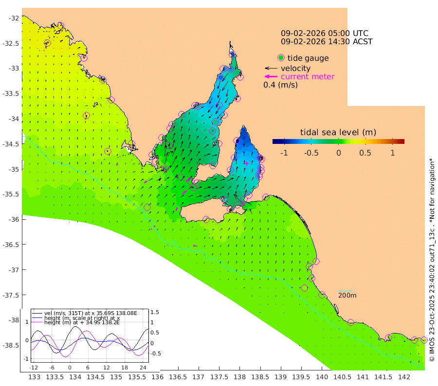 1cm/s 54T +10cm/s rms + 5cm/s 114T. SAM1DS 520m 10cm/s 59T +13cm/s rms + 5cm/s -36T. SAM2CP 100m 5cm/s 74T +21cm/s rms + 18cm/s 142T. SAM3MS 168m 7cm/s 87T +22cm/s rms + 0cm/s -30T. SAM4CY 117m 4cm/s 6T +23cm/s rms + 2cm/s 99T. SAM5CB 94m 16cm/s 51T +8cm/s rms + 3cm/s -172T. SAM6IS 83m 3cm/s 70T +11cm/s rms + 7cm/s 150T. SAM7DS 519m 17cm/s 50T +10cm/s rms + 2cm/s 87T. SAM8SG 47m 11cm/s 20T +20cm/s rms + 12cm/s -168T. NRSKAI 101m 16cm Warrnambool 15cm Port Fairy 15cm Portland 11cm Port Macdonnell 15cm Beachport 16cm Cape Rabelais (off) 14cm Robe 12cm Cape Jaffa 16cm Kingston 12cm Victor Harbor 19cm Vivonne Bay -41cm Kingscote -41cm American River -24cm Penneshaw -35cm Cape Jervis -56cm Second Valley -68cm Port Noarlunga -71cm Port Stanvac -75cm Brighton -73cm Glenelg -85cm Port Adelaide (Outer Harbor) -90cm Angus Inlet (Garden Island) -100cm Ardrossan -78cm Port Vincent -63cm Port Giles 0cm Stenhouse Bay -4cm Althorpe Island 1cm Pondalowie Bay -17cm Point Turton -17cm Port Victoria -27cm Cape Elizabeth -30cm Tiparra Reef Light -46cm Wallaroo -52cm Middle Bank -37cm Port Broughton -74cm Port Pirie -85cm Red Cliff Point (Beacon 5) -68cm Port Bonython -80cm Whyalla -77cm Western Shoal Beacon -51cm Franklin Harbor -33cm Franklin Harbor Entrance Beacon -19cm Arno Bay -10cm Port Neill -11cm Cape Hardy -5cm Tumby Bay -1cm Reevesby Island 8cm Port Lincoln 13cm Taylors Landing -11cm Whalers Bay 5cm Wedge Island Mooring 15cm Shelf Edge Mooring 22cm Coffin Bay Entrance Beacon 21cm Greenly Island 22cm Elliston 26cm Pearson Island 13cm Venus Bay 34cm Blanche Port (Streaky Bay) 37cm Thevenard 31cm St Francis Island
