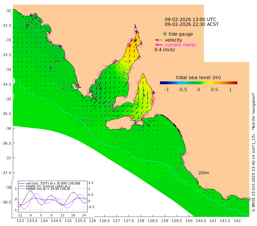 1cm/s -144T +10cm/s rms + 5cm/s 114T. SAM1DS 520m 6cm/s -106T +13cm/s rms + 5cm/s -36T. SAM2CP 100m 6cm/s -81T +21cm/s rms + 18cm/s 142T. SAM3MS 168m 6cm/s -40T +22cm/s rms + 0cm/s -30T. SAM4CY 117m 0cm/s -49T +23cm/s rms + 2cm/s 99T. SAM5CB 94m 11cm/s -111T +8cm/s rms + 3cm/s -172T. SAM6IS 83m 3cm/s -80T +11cm/s rms + 7cm/s 150T. SAM7DS 519m 11cm/s -76T +10cm/s rms + 2cm/s 87T. SAM8SG 47m 4cm/s -143T +20cm/s rms + 12cm/s -168T. NRSKAI 101m 4cm Warrnambool 4cm Port Fairy 6cm Portland 2cm Port Macdonnell 6cm Beachport 5cm Cape Rabelais (off) 4cm Robe 6cm Cape Jaffa 2cm Kingston 7cm Victor Harbor 4cm Vivonne Bay 27cm Kingscote 28cm American River 16cm Penneshaw 26cm Cape Jervis 35cm Second Valley 36cm Port Noarlunga 37cm Port Stanvac 39cm Brighton 37cm Glenelg 43cm Port Adelaide (Outer Harbor) 60cm Angus Inlet (Garden Island) 45cm Ardrossan 33cm Port Vincent 26cm Port Giles 1cm Stenhouse Bay 7cm Althorpe Island 4cm Pondalowie Bay 9cm Point Turton 10cm Port Victoria 18cm Cape Elizabeth 27cm Tiparra Reef Light 48cm Wallaroo 55cm Middle Bank 35cm Port Broughton 112cm Port Pirie 125cm Red Cliff Point (Beacon 5) 101cm Port Bonython 105cm Whyalla 97cm Western Shoal Beacon 41cm Franklin Harbor 25cm Franklin Harbor Entrance Beacon 12cm Arno Bay 1cm Port Neill 6cm Cape Hardy 2cm Tumby Bay 8cm Reevesby Island -2cm Port Lincoln -1cm Taylors Landing 8cm Whalers Bay 5cm Wedge Island Mooring 7cm Shelf Edge Mooring 1cm Coffin Bay Entrance Beacon 3cm Greenly Island -1cm Elliston -3cm Pearson Island 0cm Venus Bay -10cm Blanche Port (Streaky Bay) -10cm Thevenard -8cm St Francis Island