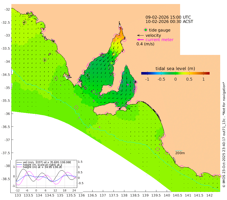 1cm/s -102T +10cm/s rms + 5cm/s 114T. SAM1DS 520m 2cm/s -117T +13cm/s rms + 5cm/s -36T. SAM2CP 100m 4cm/s -120T +21cm/s rms + 18cm/s 142T. SAM3MS 168m 7cm/s -61T +22cm/s rms + 0cm/s -30T. SAM4CY 117m 2cm/s 23T +23cm/s rms + 2cm/s 99T. SAM5CB 94m 7cm/s -119T +8cm/s rms + 3cm/s -172T. SAM6IS 83m 3cm/s -118T +11cm/s rms + 7cm/s 150T. SAM7DS 519m 7cm/s -104T +10cm/s rms + 2cm/s 87T. SAM8SG 47m 4cm/s -155T +20cm/s rms + 12cm/s -168T. NRSKAI 101m 20cm Warrnambool 19cm Port Fairy 19cm Portland 15cm Port Macdonnell 16cm Beachport 17cm Cape Rabelais (off) 17cm Robe 20cm Cape Jaffa 18cm Kingston 16cm Victor Harbor 14cm Vivonne Bay -7cm Kingscote -2cm American River -5cm Penneshaw -1cm Cape Jervis -7cm Second Valley -19cm Port Noarlunga -21cm Port Stanvac -21cm Brighton -23cm Glenelg -26cm Port Adelaide (Outer Harbor) -11cm Angus Inlet (Garden Island) -39cm Ardrossan -38cm Port Vincent -28cm Port Giles 0cm Stenhouse Bay 7cm Althorpe Island 5cm Pondalowie Bay 1cm Point Turton 1cm Port Victoria 2cm Cape Elizabeth 13cm Tiparra Reef Light 28cm Wallaroo 28cm Middle Bank 45cm Port Broughton 88cm Port Pirie 95cm Red Cliff Point (Beacon 5) 66cm Port Bonython 69cm Whyalla 66cm Western Shoal Beacon 15cm Franklin Harbor 2cm Franklin Harbor Entrance Beacon -4cm Arno Bay -11cm Port Neill -3cm Cape Hardy -3cm Tumby Bay 3cm Reevesby Island -1cm Port Lincoln 4cm Taylors Landing 4cm Whalers Bay 8cm Wedge Island Mooring 15cm Shelf Edge Mooring 16cm Coffin Bay Entrance Beacon 15cm Greenly Island 16cm Elliston 12cm Pearson Island 13cm Venus Bay 16cm Blanche Port (Streaky Bay) 17cm Thevenard 18cm St Francis Island