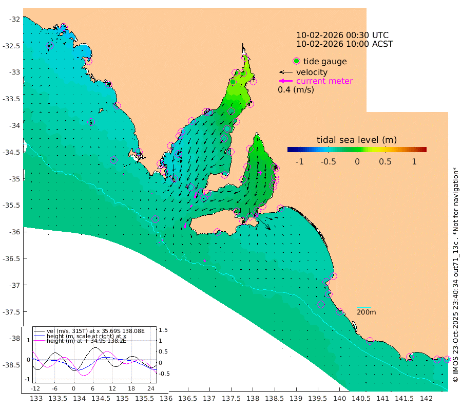 1cm/s 113T +10cm/s rms + 5cm/s 114T. SAM1DS 520m 2cm/s -165T +13cm/s rms + 5cm/s -36T. SAM2CP 100m 4cm/s 163T +21cm/s rms + 18cm/s 142T. SAM3MS 168m 7cm/s 137T +22cm/s rms + 0cm/s -30T. SAM4CY 117m 1cm/s 105T +23cm/s rms + 2cm/s 99T. SAM5CB 94m 8cm/s -130T +8cm/s rms + 3cm/s -172T. SAM6IS 83m 2cm/s 177T +11cm/s rms + 7cm/s 150T. SAM7DS 519m 19cm/s -167T +10cm/s rms + 2cm/s 87T. SAM8SG 47m 16cm/s -169T +20cm/s rms + 12cm/s -168T. NRSKAI 101m -42cm Warrnambool -39cm Port Fairy -40cm Portland -40cm Port Macdonnell -37cm Beachport -37cm Cape Rabelais (off) -39cm Robe -41cm Cape Jaffa -41cm Kingston -40cm Victor Harbor -35cm Vivonne Bay -18cm Kingscote -18cm American River -29cm Penneshaw -19cm Cape Jervis -12cm Second Valley -6cm Port Noarlunga -7cm Port Stanvac -3cm Brighton -6cm Glenelg 0cm Port Adelaide (Outer Harbor) 15cm Angus Inlet (Garden Island) 5cm Ardrossan -7cm Port Vincent -16cm Port Giles -37cm Stenhouse Bay -39cm Althorpe Island -34cm Pondalowie Bay -42cm Point Turton -40cm Port Victoria -37cm Cape Elizabeth -40cm Tiparra Reef Light -27cm Wallaroo -27cm Middle Bank 1cm Port Broughton 9cm Port Pirie 15cm Red Cliff Point (Beacon 5) 9cm Port Bonython 3cm Whyalla -5cm Western Shoal Beacon -30cm Franklin Harbor -48cm Franklin Harbor Entrance Beacon -49cm Arno Bay -56cm Port Neill -49cm Cape Hardy -51cm Tumby Bay -50cm Reevesby Island -53cm Port Lincoln -47cm Taylors Landing -41cm Whalers Bay -42cm Wedge Island Mooring -36cm Shelf Edge Mooring -45cm Coffin Bay Entrance Beacon -37cm Greenly Island -44cm Elliston -36cm Pearson Island -38cm Venus Bay -57cm Blanche Port (Streaky Bay) -56cm Thevenard -46cm St Francis Island