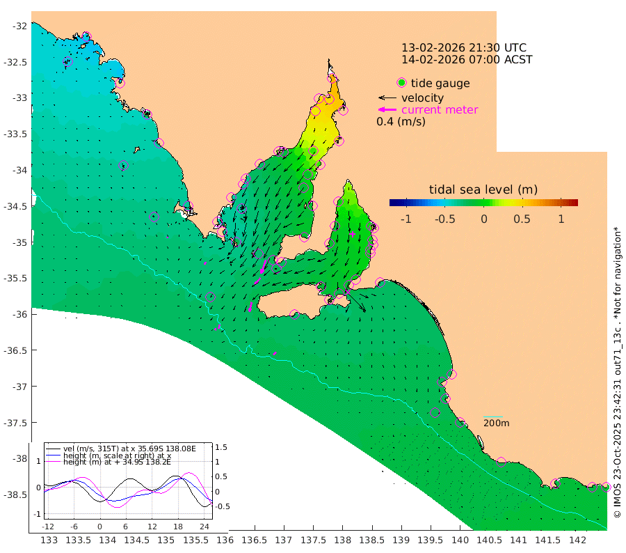 1cm/s -89T +10cm/s rms + 5cm/s 114T. SAM1DS 520m 6cm/s -142T +13cm/s rms + 5cm/s -36T. SAM2CP 100m 9cm/s -168T +21cm/s rms + 18cm/s 142T. SAM3MS 168m 8cm/s -135T +22cm/s rms + 0cm/s -30T. SAM4CY 117m 3cm/s 152T +23cm/s rms + 2cm/s 99T. SAM5CB 94m 19cm/s -137T +8cm/s rms + 3cm/s -172T. SAM6IS 83m 4cm/s -172T +11cm/s rms + 7cm/s 150T. SAM7DS 519m 32cm/s -161T +10cm/s rms + 2cm/s 87T. SAM8SG 47m 21cm/s -168T +20cm/s rms + 12cm/s -168T. NRSKAI 101m -14cm Warrnambool -16cm Port Fairy -18cm Portland -16cm Port Macdonnell -21cm Beachport -22cm Cape Rabelais (off) -20cm Robe -20cm Cape Jaffa -21cm Kingston -27cm Victor Harbor -28cm Vivonne Bay -12cm Kingscote -9cm American River -21cm Penneshaw -12cm Cape Jervis -2cm Second Valley -3cm Port Noarlunga -3cm Port Stanvac -1cm Brighton -2cm Glenelg 1cm Port Adelaide (Outer Harbor) 20cm Angus Inlet (Garden Island) -2cm Ardrossan -17cm Port Vincent -10cm Port Giles -23cm Stenhouse Bay -21cm Althorpe Island -19cm Pondalowie Bay -13cm Point Turton -15cm Port Victoria -12cm Cape Elizabeth -8cm Tiparra Reef Light 9cm Wallaroo 9cm Middle Bank 45cm Port Broughton 58cm Port Pirie 61cm Red Cliff Point (Beacon 5) 46cm Port Bonython 46cm Whyalla 38cm Western Shoal Beacon 12cm Franklin Harbor -18cm Franklin Harbor Entrance Beacon -29cm Arno Bay -35cm Port Neill -39cm Cape Hardy -41cm Tumby Bay -39cm Reevesby Island -40cm Port Lincoln -36cm Taylors Landing -22cm Whalers Bay -28cm Wedge Island Mooring -27cm Shelf Edge Mooring -35cm Coffin Bay Entrance Beacon -33cm Greenly Island -36cm Elliston -39cm Pearson Island -26cm Venus Bay -51cm Blanche Port (Streaky Bay) -52cm Thevenard -51cm St Francis Island