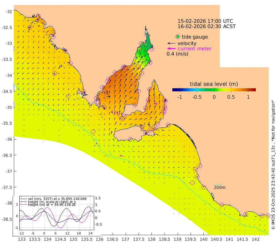 1cm/s -73T +10cm/s rms + 5cm/s 114T. SAM1DS 520m 3cm/s -101T +13cm/s rms + 5cm/s -36T. SAM2CP 100m 5cm/s -47T +21cm/s rms + 18cm/s 142T. SAM3MS 168m 11cm/s -76T +22cm/s rms + 0cm/s -30T. SAM4CY 117m 4cm/s -130T +23cm/s rms + 2cm/s 99T. SAM5CB 94m 7cm/s 52T +8cm/s rms + 3cm/s -172T. SAM6IS 83m 1cm/s -47T +11cm/s rms + 7cm/s 150T. SAM7DS 519m 19cm/s -5T +10cm/s rms + 2cm/s 87T. SAM8SG 47m 14cm/s 8T +20cm/s rms + 12cm/s -168T. NRSKAI 101m 35cm Warrnambool 35cm Port Fairy 35cm Portland 40cm Port Macdonnell 33cm Beachport 37cm Cape Rabelais (off) 36cm Robe 42cm Cape Jaffa 41cm Kingston 43cm Victor Harbor 30cm Vivonne Bay 58cm Kingscote 52cm American River 57cm Penneshaw 50cm Cape Jervis 51cm Second Valley 61cm Port Noarlunga 62cm Port Stanvac 60cm Brighton 64cm Glenelg 63cm Port Adelaide (Outer Harbor) 40cm Angus Inlet (Garden Island) 75cm Ardrossan 87cm Port Vincent 71cm Port Giles 52cm Stenhouse Bay 54cm Althorpe Island 47cm Pondalowie Bay 69cm Point Turton 69cm Port Victoria 71cm Cape Elizabeth 67cm Tiparra Reef Light 55cm Wallaroo 56cm Middle Bank 18cm Port Broughton -4cm Port Pirie -12cm Red Cliff Point (Beacon 5) 8cm Port Bonython 14cm Whyalla 22cm Western Shoal Beacon 61cm Franklin Harbor 80cm Franklin Harbor Entrance Beacon 81cm Arno Bay 90cm Port Neill 83cm Cape Hardy 80cm Tumby Bay 75cm Reevesby Island 70cm Port Lincoln 57cm Taylors Landing 64cm Whalers Bay 55cm Wedge Island Mooring 36cm Shelf Edge Mooring 50cm Coffin Bay Entrance Beacon 37cm Greenly Island 47cm Elliston 44cm Pearson Island 46cm Venus Bay 69cm Blanche Port (Streaky Bay) 63cm Thevenard 54cm St Francis Island