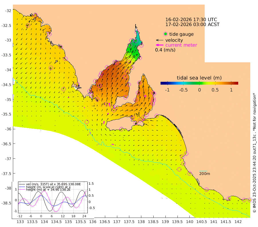 1cm/s -64T +10cm/s rms + 5cm/s 114T. SAM1DS 520m 4cm/s -102T +13cm/s rms + 5cm/s -36T. SAM2CP 100m 5cm/s -35T +21cm/s rms + 18cm/s 142T. SAM3MS 168m 10cm/s -78T +22cm/s rms + 0cm/s -30T. SAM4CY 117m 4cm/s -136T +23cm/s rms + 2cm/s 99T. SAM5CB 94m 8cm/s 54T +8cm/s rms + 3cm/s -172T. SAM6IS 83m 1cm/s -29T +11cm/s rms + 7cm/s 150T. SAM7DS 519m 20cm/s -2T +10cm/s rms + 2cm/s 87T. SAM8SG 47m 15cm/s 9T +20cm/s rms + 12cm/s -168T. NRSKAI 101m 32cm Warrnambool 32cm Port Fairy 32cm Portland 39cm Port Macdonnell 31cm Beachport 35cm Cape Rabelais (off) 35cm Robe 41cm Cape Jaffa 39cm Kingston 42cm Victor Harbor 28cm Vivonne Bay 63cm Kingscote 56cm American River 62cm Penneshaw 53cm Cape Jervis 56cm Second Valley 69cm Port Noarlunga 71cm Port Stanvac 69cm Brighton 74cm Glenelg 74cm Port Adelaide (Outer Harbor) 45cm Angus Inlet (Garden Island) 88cm Ardrossan 98cm Port Vincent 83cm Port Giles 55cm Stenhouse Bay 56cm Althorpe Island 49cm Pondalowie Bay 73cm Point Turton 74cm Port Victoria 75cm Cape Elizabeth 68cm Tiparra Reef Light 53cm Wallaroo 53cm Middle Bank 9cm Port Broughton -24cm Port Pirie -34cm Red Cliff Point (Beacon 5) -9cm Port Bonython 0cm Whyalla 10cm Western Shoal Beacon 61cm Franklin Harbor 85cm Franklin Harbor Entrance Beacon 87cm Arno Bay 98cm Port Neill 89cm Cape Hardy 86cm Tumby Bay 78cm Reevesby Island 75cm Port Lincoln 59cm Taylors Landing 68cm Whalers Bay 56cm Wedge Island Mooring 34cm Shelf Edge Mooring 49cm Coffin Bay Entrance Beacon 36cm Greenly Island 47cm Elliston 43cm Pearson Island 46cm Venus Bay 69cm Blanche Port (Streaky Bay) 63cm Thevenard 54cm St Francis Island