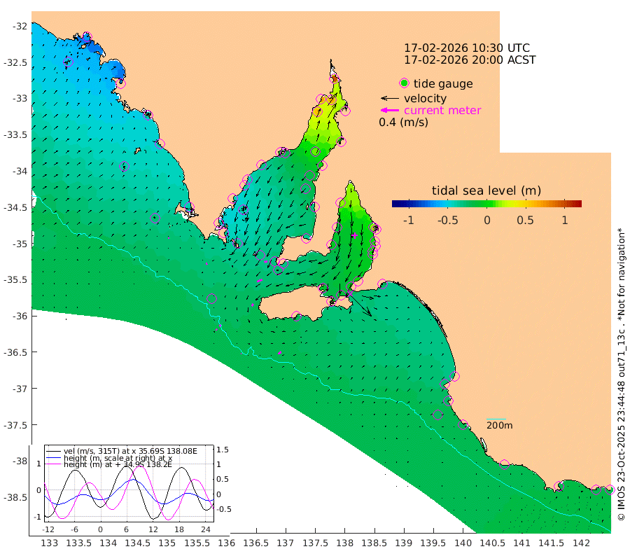 1cm/s 120T +10cm/s rms + 5cm/s 114T. SAM1DS 520m 3cm/s -108T +13cm/s rms + 5cm/s -36T. SAM2CP 100m 4cm/s -48T +21cm/s rms + 18cm/s 142T. SAM3MS 168m 8cm/s 52T +22cm/s rms + 0cm/s -30T. SAM4CY 117m 2cm/s 90T +23cm/s rms + 2cm/s 99T. SAM5CB 94m 12cm/s -112T +8cm/s rms + 3cm/s -172T. SAM6IS 83m 3cm/s -49T +11cm/s rms + 7cm/s 150T. SAM7DS 519m 7cm/s -101T +10cm/s rms + 2cm/s 87T. SAM8SG 47m 6cm/s -152T +20cm/s rms + 12cm/s -168T. NRSKAI 101m -19cm Warrnambool -20cm Port Fairy -19cm Portland -26cm Port Macdonnell -19cm Beachport -23cm Cape Rabelais (off) -24cm Robe -28cm Cape Jaffa -29cm Kingston -24cm Victor Harbor -19cm Vivonne Bay -8cm Kingscote -5cm American River -14cm Penneshaw -3cm Cape Jervis 7cm Second Valley 6cm Port Noarlunga 7cm Port Stanvac 10cm Brighton 7cm Glenelg 15cm Port Adelaide (Outer Harbor) 40cm Angus Inlet (Garden Island) 17cm Ardrossan -16cm Port Vincent -5cm Port Giles -31cm Stenhouse Bay -29cm Althorpe Island -31cm Pondalowie Bay -34cm Point Turton -33cm Port Victoria -26cm Cape Elizabeth -16cm Tiparra Reef Light 3cm Wallaroo 12cm Middle Bank -7cm Port Broughton 74cm Port Pirie 97cm Red Cliff Point (Beacon 5) 65cm Port Bonython 68cm Whyalla 58cm Western Shoal Beacon -3cm Franklin Harbor -19cm Franklin Harbor Entrance Beacon -30cm Arno Bay -44cm Port Neill -37cm Cape Hardy -40cm Tumby Bay -39cm Reevesby Island -43cm Port Lincoln -37cm Taylors Landing -32cm Whalers Bay -33cm Wedge Island Mooring -23cm Shelf Edge Mooring -40cm Coffin Bay Entrance Beacon -28cm Greenly Island -40cm Elliston -41cm Pearson Island -39cm Venus Bay -68cm Blanche Port (Streaky Bay) -64cm Thevenard -51cm St Francis Island