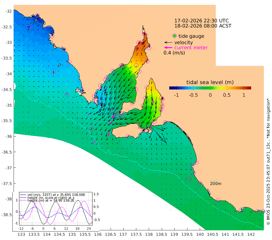1cm/s -95T +10cm/s rms + 5cm/s 114T. SAM1DS 520m 10cm/s -134T +13cm/s rms + 5cm/s -36T. SAM2CP 100m 10cm/s -142T +21cm/s rms + 18cm/s 142T. SAM3MS 168m 7cm/s -120T +22cm/s rms + 0cm/s -30T. SAM4CY 117m 3cm/s 153T +23cm/s rms + 2cm/s 99T. SAM5CB 94m 25cm/s -129T +8cm/s rms + 3cm/s -172T. SAM6IS 83m 5cm/s -139T +11cm/s rms + 7cm/s 150T. SAM7DS 519m 34cm/s -146T +10cm/s rms + 2cm/s 87T. SAM8SG 47m 26cm/s -165T +20cm/s rms + 12cm/s -168T. NRSKAI 101m -16cm Warrnambool -18cm Port Fairy -20cm Portland -22cm Port Macdonnell -23cm Beachport -24cm Cape Rabelais (off) -25cm Robe -28cm Cape Jaffa -29cm Kingston -30cm Victor Harbor -32cm Vivonne Bay 6cm Kingscote 8cm American River -13cm Penneshaw 4cm Cape Jervis 21cm Second Valley 27cm Port Noarlunga 28cm Port Stanvac 31cm Brighton 28cm Glenelg 38cm Port Adelaide (Outer Harbor) 76cm Angus Inlet (Garden Island) 42cm Ardrossan 9cm Port Vincent 9cm Port Giles -30cm Stenhouse Bay -27cm Althorpe Island -24cm Pondalowie Bay -15cm Point Turton -15cm Port Victoria -8cm Cape Elizabeth 5cm Tiparra Reef Light 37cm Wallaroo 43cm Middle Bank 63cm Port Broughton 136cm Port Pirie 146cm Red Cliff Point (Beacon 5) 130cm Port Bonython 122cm Whyalla 100cm Western Shoal Beacon 27cm Franklin Harbor -13cm Franklin Harbor Entrance Beacon -29cm Arno Bay -40cm Port Neill -41cm Cape Hardy -48cm Tumby Bay -44cm Reevesby Island -53cm Port Lincoln -48cm Taylors Landing -27cm Whalers Bay -35cm Wedge Island Mooring -30cm Shelf Edge Mooring -48cm Coffin Bay Entrance Beacon -39cm Greenly Island -52cm Elliston -47cm Pearson Island -39cm Venus Bay -79cm Blanche Port (Streaky Bay) -79cm Thevenard -65cm St Francis Island