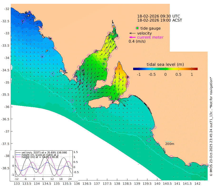 1cm/s 129T +10cm/s rms + 5cm/s 114T. SAM1DS 520m 7cm/s -121T +13cm/s rms + 5cm/s -36T. SAM2CP 100m 4cm/s -50T +21cm/s rms + 18cm/s 142T. SAM3MS 168m 8cm/s 78T +22cm/s rms + 0cm/s -30T. SAM4CY 117m 4cm/s 170T +23cm/s rms + 2cm/s 99T. SAM5CB 94m 13cm/s -121T +8cm/s rms + 3cm/s -172T. SAM6IS 83m 2cm/s -35T +11cm/s rms + 7cm/s 150T. SAM7DS 519m 10cm/s -122T +10cm/s rms + 2cm/s 87T. SAM8SG 47m 9cm/s -160T +20cm/s rms + 12cm/s -168T. NRSKAI 101m -35cm Warrnambool -34cm Port Fairy -35cm Portland -37cm Port Macdonnell -35cm Beachport -39cm Cape Rabelais (off) -38cm Robe -41cm Cape Jaffa -42cm Kingston -35cm Victor Harbor -35cm Vivonne Bay 18cm Kingscote 16cm American River 4cm Penneshaw 17cm Cape Jervis 37cm Second Valley 52cm Port Noarlunga 56cm Port Stanvac 58cm Brighton 57cm Glenelg 72cm Port Adelaide (Outer Harbor) 84cm Angus Inlet (Garden Island) 89cm Ardrossan 52cm Port Vincent 46cm Port Giles -26cm Stenhouse Bay -26cm Althorpe Island -29cm Pondalowie Bay -16cm Point Turton -13cm Port Victoria -5cm Cape Elizabeth 0cm Tiparra Reef Light 12cm Wallaroo 22cm Middle Bank -23cm Port Broughton 39cm Port Pirie 62cm Red Cliff Point (Beacon 5) 43cm Port Bonython 51cm Whyalla 47cm Western Shoal Beacon 22cm Franklin Harbor 8cm Franklin Harbor Entrance Beacon -7cm Arno Bay -19cm Port Neill -19cm Cape Hardy -26cm Tumby Bay -25cm Reevesby Island -34cm Port Lincoln -39cm Taylors Landing -20cm Whalers Bay -33cm Wedge Island Mooring -37cm Shelf Edge Mooring -51cm Coffin Bay Entrance Beacon -42cm Greenly Island -54cm Elliston -57cm Pearson Island -43cm Venus Bay -78cm Blanche Port (Streaky Bay) -76cm Thevenard -68cm St Francis Island