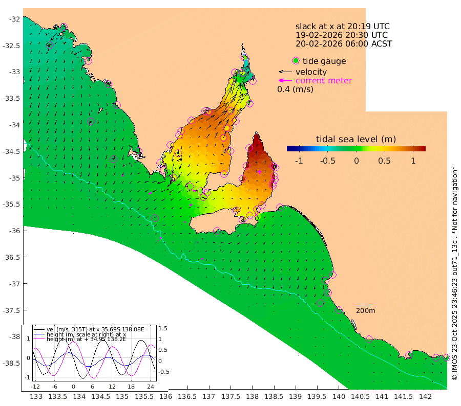 0cm/s -35T +10cm/s rms + 5cm/s 114T. SAM1DS 520m 10cm/s -121T +13cm/s rms + 5cm/s -36T. SAM2CP 100m 5cm/s -68T +21cm/s rms + 18cm/s 142T. SAM3MS 168m 6cm/s -101T +22cm/s rms + 0cm/s -30T. SAM4CY 117m 7cm/s -165T +23cm/s rms + 2cm/s 99T. SAM5CB 94m 8cm/s -129T +8cm/s rms + 3cm/s -172T. SAM6IS 83m 1cm/s -68T +11cm/s rms + 7cm/s 150T. SAM7DS 519m 9cm/s -83T +10cm/s rms + 2cm/s 87T. SAM8SG 47m 3cm/s -140T +20cm/s rms + 12cm/s -168T. NRSKAI 101m -13cm Warrnambool -11cm Port Fairy -13cm Portland -5cm Port Macdonnell -12cm Beachport -12cm Cape Rabelais (off) -11cm Robe -9cm Cape Jaffa -12cm Kingston -6cm Victor Harbor -17cm Vivonne Bay 66cm Kingscote 57cm American River 48cm Penneshaw 53cm Cape Jervis 77cm Second Valley 102cm Port Noarlunga 107cm Port Stanvac 110cm Brighton 112cm Glenelg 124cm Port Adelaide (Outer Harbor) 114cm Angus Inlet (Garden Island) 152cm Ardrossan 126cm Port Vincent 107cm Port Giles 20cm Stenhouse Bay 18cm Althorpe Island 13cm Pondalowie Bay 44cm Point Turton 48cm Port Victoria 53cm Cape Elizabeth 47cm Tiparra Reef Light 48cm Wallaroo 56cm Middle Bank 5cm Port Broughton 8cm Port Pirie 11cm Red Cliff Point (Beacon 5) 26cm Port Bonython 36cm Whyalla 37cm Western Shoal Beacon 64cm Franklin Harbor 66cm Franklin Harbor Entrance Beacon 57cm Arno Bay 56cm Port Neill 46cm Cape Hardy 39cm Tumby Bay 29cm Reevesby Island 22cm Port Lincoln 6cm Taylors Landing 34cm Whalers Bay 11cm Wedge Island Mooring -11cm Shelf Edge Mooring -13cm Coffin Bay Entrance Beacon -15cm Greenly Island -15cm Elliston -18cm Pearson Island -5cm Venus Bay -20cm Blanche Port (Streaky Bay) -24cm Thevenard -25cm St Francis Island