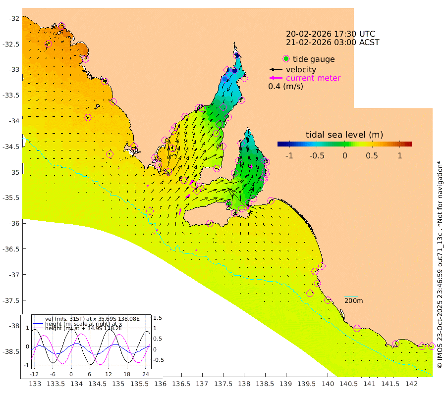 1cm/s -57T +10cm/s rms + 5cm/s 114T. SAM1DS 520m 7cm/s 52T +13cm/s rms + 5cm/s -36T. SAM2CP 100m 5cm/s 53T +21cm/s rms + 18cm/s 142T. SAM3MS 168m 4cm/s -73T +22cm/s rms + 0cm/s -30T. SAM4CY 117m 1cm/s -47T +23cm/s rms + 2cm/s 99T. SAM5CB 94m 17cm/s 56T +8cm/s rms + 3cm/s -172T. SAM6IS 83m 2cm/s 67T +11cm/s rms + 7cm/s 150T. SAM7DS 519m 20cm/s 39T +10cm/s rms + 2cm/s 87T. SAM8SG 47m 19cm/s 15T +20cm/s rms + 12cm/s -168T. NRSKAI 101m 24cm Warrnambool 24cm Port Fairy 25cm Portland 31cm Port Macdonnell 26cm Beachport 28cm Cape Rabelais (off) 29cm Robe 35cm Cape Jaffa 34cm Kingston 31cm Victor Harbor 28cm Vivonne Bay 0cm Kingscote -2cm American River 15cm Penneshaw -1cm Cape Jervis -13cm Second Valley -21cm Port Noarlunga -21cm Port Stanvac -24cm Brighton -21cm Glenelg -32cm Port Adelaide (Outer Harbor) -66cm Angus Inlet (Garden Island) -38cm Ardrossan -8cm Port Vincent -4cm Port Giles 33cm Stenhouse Bay 31cm Althorpe Island 29cm Pondalowie Bay 28cm Point Turton 28cm Port Victoria 22cm Cape Elizabeth 9cm Tiparra Reef Light -18cm Wallaroo -24cm Middle Bank -21cm Port Broughton -104cm Port Pirie -118cm Red Cliff Point (Beacon 5) -104cm Port Bonython -94cm Whyalla -77cm Western Shoal Beacon -7cm Franklin Harbor 22cm Franklin Harbor Entrance Beacon 34cm Arno Bay 45cm Port Neill 44cm Cape Hardy 50cm Tumby Bay 41cm Reevesby Island 51cm Port Lincoln 46cm Taylors Landing 33cm Whalers Bay 37cm Wedge Island Mooring 29cm Shelf Edge Mooring 46cm Coffin Bay Entrance Beacon 35cm Greenly Island 50cm Elliston 43cm Pearson Island 40cm Venus Bay 74cm Blanche Port (Streaky Bay) 71cm Thevenard 53cm St Francis Island