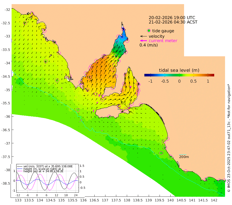 1cm/s -43T +10cm/s rms + 5cm/s 114T. SAM1DS 520m 1cm/s -42T +13cm/s rms + 5cm/s -36T. SAM2CP 100m 5cm/s 25T +21cm/s rms + 18cm/s 142T. SAM3MS 168m 4cm/s -101T +22cm/s rms + 0cm/s -30T. SAM4CY 117m 4cm/s -152T +23cm/s rms + 2cm/s 99T. SAM5CB 94m 9cm/s 59T +8cm/s rms + 3cm/s -172T. SAM6IS 83m 2cm/s 50T +11cm/s rms + 7cm/s 150T. SAM7DS 519m 14cm/s 25T +10cm/s rms + 2cm/s 87T. SAM8SG 47m 14cm/s 13T +20cm/s rms + 12cm/s -168T. NRSKAI 101m 5cm Warrnambool 6cm Port Fairy 6cm Portland 15cm Port Macdonnell 8cm Beachport 9cm Cape Rabelais (off) 10cm Robe 16cm Cape Jaffa 14cm Kingston 16cm Victor Harbor 8cm Vivonne Bay 38cm Kingscote 31cm American River 39cm Penneshaw 30cm Cape Jervis 35cm Second Valley 46cm Port Noarlunga 49cm Port Stanvac 48cm Brighton 53cm Glenelg 52cm Port Adelaide (Outer Harbor) 17cm Angus Inlet (Garden Island) 66cm Ardrossan 74cm Port Vincent 64cm Port Giles 36cm Stenhouse Bay 32cm Althorpe Island 28cm Pondalowie Bay 45cm Point Turton 47cm Port Victoria 46cm Cape Elizabeth 30cm Tiparra Reef Light 7cm Wallaroo 7cm Middle Bank -24cm Port Broughton -94cm Port Pirie -103cm Red Cliff Point (Beacon 5) -79cm Port Bonython -66cm Whyalla -51cm Western Shoal Beacon 28cm Franklin Harbor 54cm Franklin Harbor Entrance Beacon 58cm Arno Bay 67cm Port Neill 59cm Cape Hardy 59cm Tumby Bay 47cm Reevesby Island 51cm Port Lincoln 37cm Taylors Landing 43cm Whalers Bay 32cm Wedge Island Mooring 12cm Shelf Edge Mooring 24cm Coffin Bay Entrance Beacon 14cm Greenly Island 26cm Elliston 19cm Pearson Island 25cm Venus Bay 41cm Blanche Port (Streaky Bay) 38cm Thevenard 21cm St Francis Island