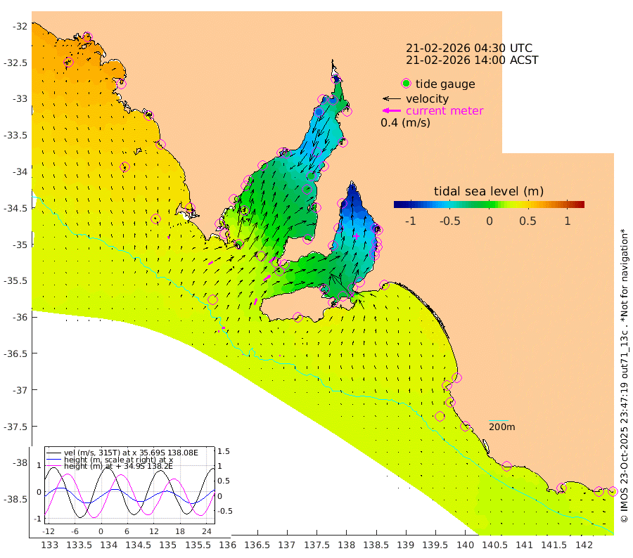 1cm/s 12T +10cm/s rms + 5cm/s 114T. SAM1DS 520m 11cm/s 56T +13cm/s rms + 5cm/s -36T. SAM2CP 100m 6cm/s 94T +21cm/s rms + 18cm/s 142T. SAM3MS 168m 2cm/s 110T +22cm/s rms + 0cm/s -30T. SAM4CY 117m 5cm/s -8T +23cm/s rms + 2cm/s 99T. SAM5CB 94m 19cm/s 53T +8cm/s rms + 3cm/s -172T. SAM6IS 83m 3cm/s 88T +11cm/s rms + 7cm/s 150T. SAM7DS 519m 18cm/s 53T +10cm/s rms + 2cm/s 87T. SAM8SG 47m 14cm/s 20T +20cm/s rms + 12cm/s -168T. NRSKAI 101m 31cm Warrnambool 29cm Port Fairy 30cm Portland 30cm Port Macdonnell 30cm Beachport 32cm Cape Rabelais (off) 32cm Robe 31cm Cape Jaffa 33cm Kingston 29cm Victor Harbor 34cm Vivonne Bay -33cm Kingscote -32cm American River -13cm Penneshaw -28cm Cape Jervis -53cm Second Valley -67cm Port Noarlunga -71cm Port Stanvac -76cm Brighton -74cm Glenelg -88cm Port Adelaide (Outer Harbor) -103cm Angus Inlet (Garden Island) -105cm Ardrossan -72cm Port Vincent -59cm Port Giles 18cm Stenhouse Bay 14cm Althorpe Island 19cm Pondalowie Bay 2cm Point Turton -1cm Port Victoria -13cm Cape Elizabeth -15cm Tiparra Reef Light -36cm Wallaroo -46cm Middle Bank -18cm Port Broughton -78cm Port Pirie -104cm Red Cliff Point (Beacon 5) -78cm Port Bonython -86cm Whyalla -79cm Western Shoal Beacon -45cm Franklin Harbor -22cm Franklin Harbor Entrance Beacon -4cm Arno Bay 7cm Port Neill 9cm Cape Hardy 16cm Tumby Bay 20cm Reevesby Island 30cm Port Lincoln 33cm Taylors Landing 8cm Whalers Bay 24cm Wedge Island Mooring 31cm Shelf Edge Mooring 43cm Coffin Bay Entrance Beacon 38cm Greenly Island 45cm Elliston 49cm Pearson Island 34cm Venus Bay 67cm Blanche Port (Streaky Bay) 68cm Thevenard 60cm St Francis Island