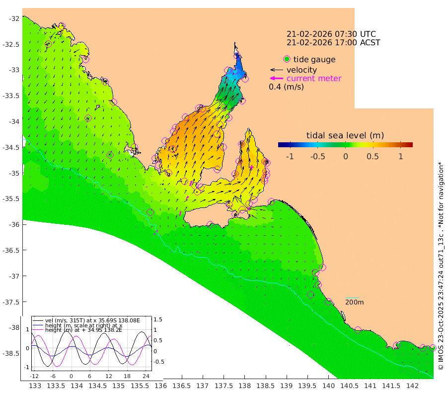 1cm/s 114T +10cm/s rms + 5cm/s 114T. SAM1DS 520m 2cm/s -51T +13cm/s rms + 5cm/s -36T. SAM2CP 100m 5cm/s 26T +21cm/s rms + 18cm/s 142T. SAM3MS 168m 2cm/s 137T +22cm/s rms + 0cm/s -30T. SAM4CY 117m 4cm/s -138T +23cm/s rms + 2cm/s 99T. SAM5CB 94m 10cm/s 49T +8cm/s rms + 3cm/s -172T. SAM6IS 83m 3cm/s 48T +11cm/s rms + 7cm/s 150T. SAM7DS 519m 16cm/s 23T +10cm/s rms + 2cm/s 87T. SAM8SG 47m 14cm/s 15T +20cm/s rms + 12cm/s -168T. NRSKAI 101m 2cm Warrnambool 2cm Port Fairy 3cm Portland 9cm Port Macdonnell 5cm Beachport 6cm Cape Rabelais (off) 8cm Robe 8cm Cape Jaffa 9cm Kingston 13cm Victor Harbor 7cm Vivonne Bay 44cm Kingscote 38cm American River 44cm Penneshaw 36cm Cape Jervis 42cm Second Valley 60cm Port Noarlunga 64cm Port Stanvac 61cm Brighton 68cm Glenelg 70cm Port Adelaide (Outer Harbor) 41cm Angus Inlet (Garden Island) 89cm Ardrossan 92cm Port Vincent 77cm Port Giles 36cm Stenhouse Bay 31cm Althorpe Island 27cm Pondalowie Bay 46cm Point Turton 45cm Port Victoria 42cm Cape Elizabeth 38cm Tiparra Reef Light 14cm Wallaroo 14cm Middle Bank -35cm Port Broughton -80cm Port Pirie -93cm Red Cliff Point (Beacon 5) -56cm Port Bonython -50cm Whyalla -36cm Western Shoal Beacon 29cm Franklin Harbor 55cm Franklin Harbor Entrance Beacon 60cm Arno Bay 70cm Port Neill 58cm Cape Hardy 55cm Tumby Bay 52cm Reevesby Island 50cm Port Lincoln 34cm Taylors Landing 42cm Whalers Bay 30cm Wedge Island Mooring 10cm Shelf Edge Mooring 20cm Coffin Bay Entrance Beacon 11cm Greenly Island 18cm Elliston 14cm Pearson Island 21cm Venus Bay 32cm Blanche Port (Streaky Bay) 30cm Thevenard 16cm St Francis Island