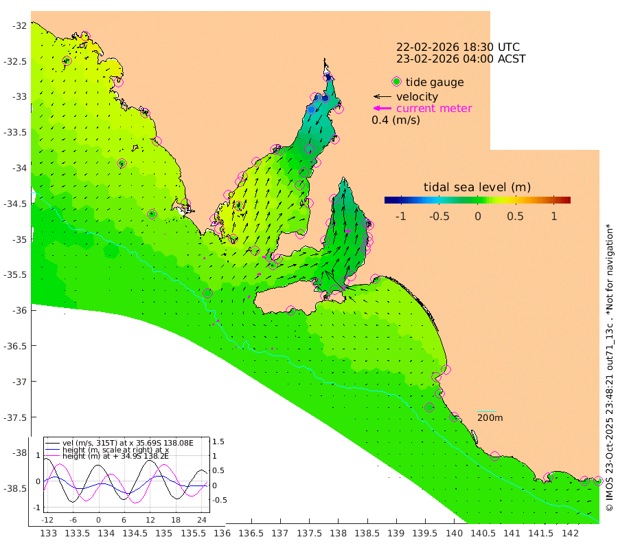 1cm/s -63T +10cm/s rms + 5cm/s 114T. SAM1DS 520m 4cm/s 68T +13cm/s rms + 5cm/s -36T. SAM2CP 100m 5cm/s 98T +21cm/s rms + 18cm/s 142T. SAM3MS 168m 4cm/s -141T +22cm/s rms + 0cm/s -30T. SAM4CY 117m 1cm/s -162T +23cm/s rms + 2cm/s 99T. SAM5CB 94m 8cm/s 77T +8cm/s rms + 3cm/s -172T. SAM6IS 83m 2cm/s 113T +11cm/s rms + 7cm/s 150T. SAM7DS 519m 8cm/s 104T +10cm/s rms + 2cm/s 87T. SAM8SG 47m 6cm/s 23T +20cm/s rms + 12cm/s -168T. NRSKAI 101m 6cm Warrnambool 5cm Port Fairy 5cm Portland 11cm Port Macdonnell 4cm Beachport 5cm Cape Rabelais (off) 8cm Robe 11cm Cape Jaffa 12cm Kingston 7cm Victor Harbor 4cm Vivonne Bay -9cm Kingscote -10cm American River 0cm Penneshaw -10cm Cape Jervis -16cm Second Valley -19cm Port Noarlunga -19cm Port Stanvac -22cm Brighton -19cm Glenelg -26cm Port Adelaide (Outer Harbor) -52cm Angus Inlet (Garden Island) -28cm Ardrossan -10cm Port Vincent -6cm Port Giles 13cm Stenhouse Bay 10cm Althorpe Island 11cm Pondalowie Bay 14cm Point Turton 12cm Port Victoria 9cm Cape Elizabeth -3cm Tiparra Reef Light -23cm Wallaroo -29cm Middle Bank -13cm Port Broughton -93cm Port Pirie -103cm Red Cliff Point (Beacon 5) -93cm Port Bonython -84cm Whyalla -72cm Western Shoal Beacon -9cm Franklin Harbor 5cm Franklin Harbor Entrance Beacon 12cm Arno Bay 20cm Port Neill 18cm Cape Hardy 21cm Tumby Bay 14cm Reevesby Island 21cm Port Lincoln 17cm Taylors Landing 13cm Whalers Bay 13cm Wedge Island Mooring 4cm Shelf Edge Mooring 16cm Coffin Bay Entrance Beacon 7cm Greenly Island 17cm Elliston 11cm Pearson Island 17cm Venus Bay 32cm Blanche Port (Streaky Bay) 29cm Thevenard 14cm St Francis Island
