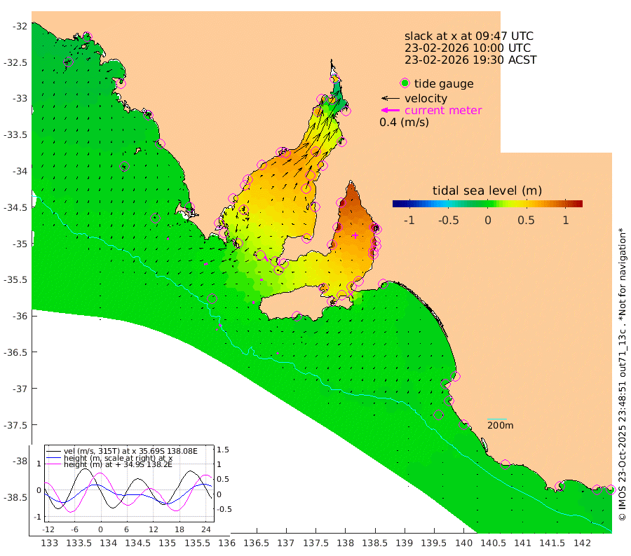 0cm/s 174T +10cm/s rms + 5cm/s 114T. SAM1DS 520m 8cm/s -104T +13cm/s rms + 5cm/s -36T. SAM2CP 100m 6cm/s -44T +21cm/s rms + 18cm/s 142T. SAM3MS 168m 4cm/s -45T +22cm/s rms + 0cm/s -30T. SAM4CY 117m 4cm/s -141T +23cm/s rms + 2cm/s 99T. SAM5CB 94m 4cm/s -90T +8cm/s rms + 3cm/s -172T. SAM6IS 83m 3cm/s -28T +11cm/s rms + 7cm/s 150T. SAM7DS 519m 13cm/s -34T +10cm/s rms + 2cm/s 87T. SAM8SG 47m 5cm/s -4T +20cm/s rms + 12cm/s -168T. NRSKAI 101m -1cm Warrnambool -1cm Port Fairy 1cm Portland 3cm Port Macdonnell 3cm Beachport 3cm Cape Rabelais (off) 3cm Robe 2cm Cape Jaffa 1cm Kingston 9cm Victor Harbor 2cm Vivonne Bay 65cm Kingscote 61cm American River 51cm Penneshaw 56cm Cape Jervis 74cm Second Valley 93cm Port Noarlunga 98cm Port Stanvac 100cm Brighton 103cm Glenelg 112cm Port Adelaide (Outer Harbor) 110cm Angus Inlet (Garden Island) 134cm Ardrossan 115cm Port Vincent 97cm Port Giles 26cm Stenhouse Bay 27cm Althorpe Island 20cm Pondalowie Bay 42cm Point Turton 43cm Port Victoria 48cm Cape Elizabeth 55cm Tiparra Reef Light 57cm Wallaroo 65cm Middle Bank 9cm Port Broughton 49cm Port Pirie 53cm Red Cliff Point (Beacon 5) 63cm Port Bonython 68cm Whyalla 68cm Western Shoal Beacon 61cm Franklin Harbor 65cm Franklin Harbor Entrance Beacon 56cm Arno Bay 56cm Port Neill 47cm Cape Hardy 40cm Tumby Bay 39cm Reevesby Island 30cm Port Lincoln 18cm Taylors Landing 37cm Whalers Bay 22cm Wedge Island Mooring 7cm Shelf Edge Mooring 4cm Coffin Bay Entrance Beacon 1cm Greenly Island 1cm Elliston -1cm Pearson Island 6cm Venus Bay -3cm Blanche Port (Streaky Bay) -5cm Thevenard -8cm St Francis Island