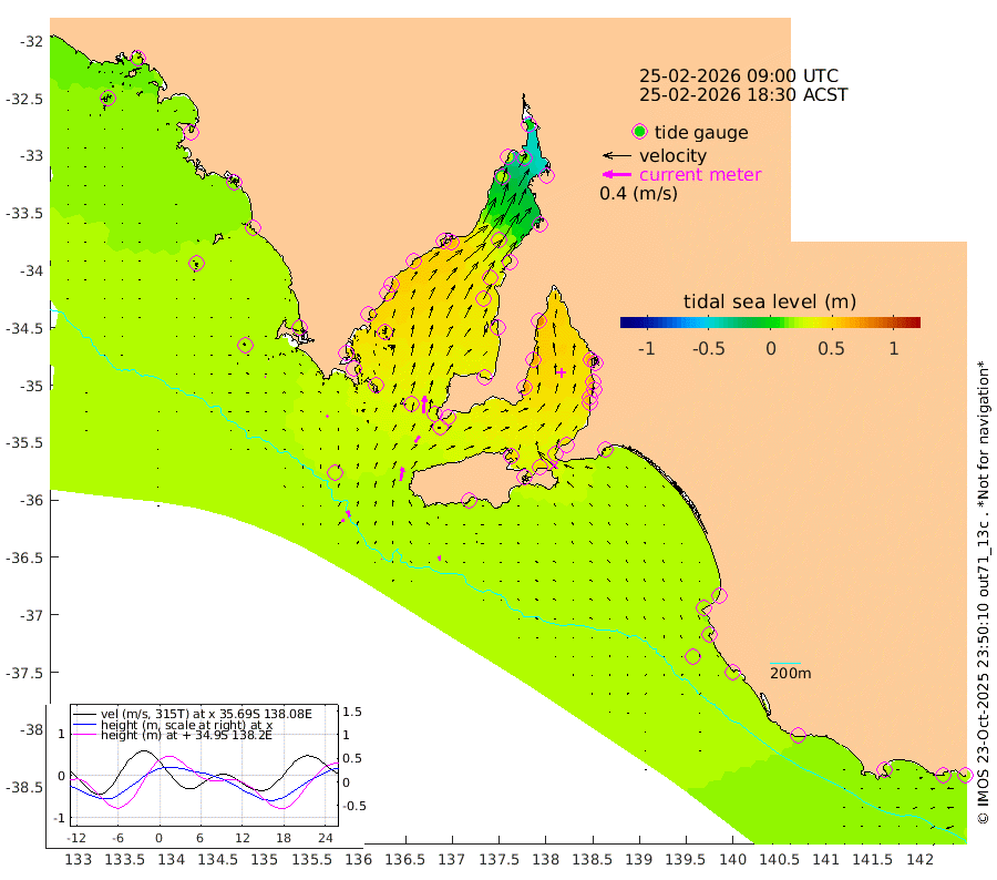 0cm/s 47T +10cm/s rms + 5cm/s 114T. SAM1DS 520m 3cm/s -41T +13cm/s rms + 5cm/s -36T. SAM2CP 100m 8cm/s -19T +21cm/s rms + 18cm/s 142T. SAM3MS 168m 6cm/s -6T +22cm/s rms + 0cm/s -30T. SAM4CY 117m 2cm/s -91T +23cm/s rms + 2cm/s 99T. SAM5CB 94m 11cm/s 35T +8cm/s rms + 3cm/s -172T. SAM6IS 83m 4cm/s -11T +11cm/s rms + 7cm/s 150T. SAM7DS 519m 25cm/s 4T +10cm/s rms + 2cm/s 87T. SAM8SG 47m 18cm/s 9T +20cm/s rms + 12cm/s -168T. NRSKAI 101m 20cm Warrnambool 19cm Port Fairy 21cm Portland 21cm Port Macdonnell 23cm Beachport 22cm Cape Rabelais (off) 22cm Robe 22cm Cape Jaffa 20cm Kingston 27cm Victor Harbor 23cm Vivonne Bay 47cm Kingscote 41cm American River 46cm Penneshaw 41cm Cape Jervis 48cm Second Valley 55cm Port Noarlunga 58cm Port Stanvac 58cm Brighton 60cm Glenelg 64cm Port Adelaide (Outer Harbor) 52cm Angus Inlet (Garden Island) 75cm Ardrossan 66cm Port Vincent 64cm Port Giles 34cm Stenhouse Bay 32cm Althorpe Island 27cm Pondalowie Bay 39cm Point Turton 39cm Port Victoria 41cm Cape Elizabeth 41cm Tiparra Reef Light 33cm Wallaroo 40cm Middle Bank -19cm Port Broughton 0cm Port Pirie -3cm Red Cliff Point (Beacon 5) 13cm Port Bonython 19cm Whyalla 21cm Western Shoal Beacon 37cm Franklin Harbor 56cm Franklin Harbor Entrance Beacon 55cm Arno Bay 57cm Port Neill 52cm Cape Hardy 50cm Tumby Bay 45cm Reevesby Island 45cm Port Lincoln 36cm Taylors Landing 38cm Whalers Bay 34cm Wedge Island Mooring 25cm Shelf Edge Mooring 23cm Coffin Bay Entrance Beacon 22cm Greenly Island 23cm Elliston 20cm Pearson Island 18cm Venus Bay 21cm Blanche Port (Streaky Bay) 21cm Thevenard 14cm St Francis Island