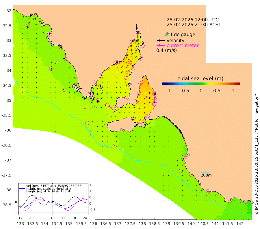 1cm/s -110T +10cm/s rms + 5cm/s 114T. SAM1DS 520m 6cm/s -96T +13cm/s rms + 5cm/s -36T. SAM2CP 100m 7cm/s -60T +21cm/s rms + 18cm/s 142T. SAM3MS 168m 9cm/s -47T +22cm/s rms + 0cm/s -30T. SAM4CY 117m 2cm/s -68T +23cm/s rms + 2cm/s 99T. SAM5CB 94m 5cm/s -72T +8cm/s rms + 3cm/s -172T. SAM6IS 83m 3cm/s -59T +11cm/s rms + 7cm/s 150T. SAM7DS 519m 16cm/s -31T +10cm/s rms + 2cm/s 87T. SAM8SG 47m 6cm/s -7T +20cm/s rms + 12cm/s -168T. NRSKAI 101m 15cm Warrnambool 16cm Port Fairy 19cm Portland 17cm Port Macdonnell 20cm Beachport 21cm Cape Rabelais (off) 20cm Robe 22cm Cape Jaffa 18cm Kingston 25cm Victor Harbor 19cm Vivonne Bay 51cm Kingscote 50cm American River 42cm Penneshaw 47cm Cape Jervis 56cm Second Valley 62cm Port Noarlunga 64cm Port Stanvac 67cm Brighton 66cm Glenelg 71cm Port Adelaide (Outer Harbor) 79cm Angus Inlet (Garden Island) 79cm Ardrossan 70cm Port Vincent 58cm Port Giles 26cm Stenhouse Bay 32cm Althorpe Island 25cm Pondalowie Bay 34cm Point Turton 35cm Port Victoria 41cm Cape Elizabeth 49cm Tiparra Reef Light 62cm Wallaroo 69cm Middle Bank 35cm Port Broughton 96cm Port Pirie 103cm Red Cliff Point (Beacon 5) 97cm Port Bonython 98cm Whyalla 93cm Western Shoal Beacon 53cm Franklin Harbor 52cm Franklin Harbor Entrance Beacon 44cm Arno Bay 41cm Port Neill 39cm Cape Hardy 36cm Tumby Bay 36cm Reevesby Island 29cm Port Lincoln 25cm Taylors Landing 34cm Whalers Bay 29cm Wedge Island Mooring 25cm Shelf Edge Mooring 22cm Coffin Bay Entrance Beacon 20cm Greenly Island 22cm Elliston 21cm Pearson Island 19cm Venus Bay 19cm Blanche Port (Streaky Bay) 17cm Thevenard 18cm St Francis Island