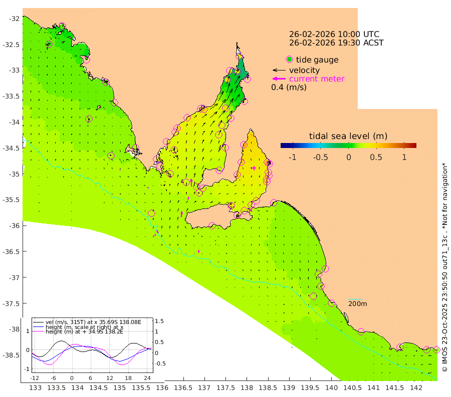 0cm/s 47T +10cm/s rms + 5cm/s 114T. SAM1DS 520m 3cm/s -50T +13cm/s rms + 5cm/s -36T. SAM2CP 100m 9cm/s -28T +21cm/s rms + 18cm/s 142T. SAM3MS 168m 8cm/s -8T +22cm/s rms + 0cm/s -30T. SAM4CY 117m 2cm/s -54T +23cm/s rms + 2cm/s 99T. SAM5CB 94m 8cm/s 27T +8cm/s rms + 3cm/s -172T. SAM6IS 83m 4cm/s -24T +11cm/s rms + 7cm/s 150T. SAM7DS 519m 23cm/s -1T +10cm/s rms + 2cm/s 87T. SAM8SG 47m 16cm/s 7T +20cm/s rms + 12cm/s -168T. NRSKAI 101m 18cm Warrnambool 18cm Port Fairy 20cm Portland 18cm Port Macdonnell 22cm Beachport 21cm Cape Rabelais (off) 20cm Robe 20cm Cape Jaffa 18cm Kingston 25cm Victor Harbor 22cm Vivonne Bay 42cm Kingscote 38cm American River 40cm Penneshaw 37cm Cape Jervis 45cm Second Valley 49cm Port Noarlunga 51cm Port Stanvac 52cm Brighton 52cm Glenelg 56cm Port Adelaide (Outer Harbor) 54cm Angus Inlet (Garden Island) 64cm Ardrossan 55cm Port Vincent 53cm Port Giles 27cm Stenhouse Bay 27cm Althorpe Island 21cm Pondalowie Bay 29cm Point Turton 29cm Port Victoria 33cm Cape Elizabeth 35cm Tiparra Reef Light 35cm Wallaroo 43cm Middle Bank -8cm Port Broughton 33cm Port Pirie 37cm Red Cliff Point (Beacon 5) 41cm Port Bonython 45cm Whyalla 41cm Western Shoal Beacon 35cm Franklin Harbor 47cm Franklin Harbor Entrance Beacon 43cm Arno Bay 42cm Port Neill 39cm Cape Hardy 37cm Tumby Bay 33cm Reevesby Island 33cm Port Lincoln 29cm Taylors Landing 29cm Whalers Bay 28cm Wedge Island Mooring 24cm Shelf Edge Mooring 19cm Coffin Bay Entrance Beacon 20cm Greenly Island 19cm Elliston 17cm Pearson Island 12cm Venus Bay 13cm Blanche Port (Streaky Bay) 12cm Thevenard 9cm St Francis Island