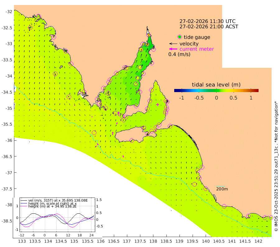 0cm/s -12T +10cm/s rms + 5cm/s 114T. SAM1DS 520m 3cm/s -33T +13cm/s rms + 5cm/s -36T. SAM2CP 100m 8cm/s -35T +21cm/s rms + 18cm/s 142T. SAM3MS 168m 9cm/s -17T +22cm/s rms + 0cm/s -30T. SAM4CY 117m 3cm/s -17T +23cm/s rms + 2cm/s 99T. SAM5CB 94m 8cm/s 25T +8cm/s rms + 3cm/s -172T. SAM6IS 83m 4cm/s -37T +11cm/s rms + 7cm/s 150T. SAM7DS 519m 22cm/s -4T +10cm/s rms + 2cm/s 87T. SAM8SG 47m 14cm/s 5T +20cm/s rms + 12cm/s -168T. NRSKAI 101m 22cm Warrnambool 22cm Port Fairy 25cm Portland 22cm Port Macdonnell 28cm Beachport 27cm Cape Rabelais (off) 25cm Robe 27cm Cape Jaffa 24cm Kingston 30cm Victor Harbor 28cm Vivonne Bay 31cm Kingscote 30cm American River 31cm Penneshaw 29cm Cape Jervis 32cm Second Valley 29cm Port Noarlunga 29cm Port Stanvac 32cm Brighton 30cm Glenelg 31cm Port Adelaide (Outer Harbor) 34cm Angus Inlet (Garden Island) 31cm Ardrossan 31cm Port Vincent 28cm Port Giles 23cm Stenhouse Bay 26cm Althorpe Island 21cm Pondalowie Bay 20cm Point Turton 21cm Port Victoria 26cm Cape Elizabeth 27cm Tiparra Reef Light 34cm Wallaroo 40cm Middle Bank 7cm Port Broughton 58cm Port Pirie 63cm Red Cliff Point (Beacon 5) 57cm Port Bonython 58cm Whyalla 52cm Western Shoal Beacon 28cm Franklin Harbor 34cm Franklin Harbor Entrance Beacon 31cm Arno Bay 29cm Port Neill 30cm Cape Hardy 30cm Tumby Bay 28cm Reevesby Island 28cm Port Lincoln 29cm Taylors Landing 23cm Whalers Bay 28cm Wedge Island Mooring 31cm Shelf Edge Mooring 27cm Coffin Bay Entrance Beacon 28cm Greenly Island 28cm Elliston 27cm Pearson Island 18cm Venus Bay 24cm Blanche Port (Streaky Bay) 24cm Thevenard 21cm St Francis Island