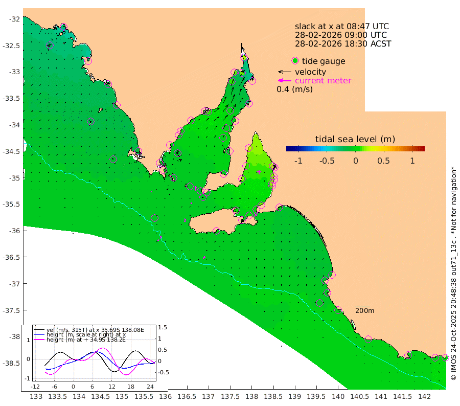 1cm/s 90T +10cm/s rms + 5cm/s 114T. SAM1DS 520m 2cm/s -28T +13cm/s rms + 5cm/s -36T. SAM2CP 100m 7cm/s -13T +21cm/s rms + 18cm/s 142T. SAM3MS 168m 9cm/s 49T +22cm/s rms + 0cm/s -30T. SAM4CY 117m 1cm/s 134T +23cm/s rms + 2cm/s 99T. SAM5CB 94m 4cm/s 3T +8cm/s rms + 3cm/s -172T. SAM6IS 83m 4cm/s -10T +11cm/s rms + 7cm/s 150T. SAM7DS 519m 13cm/s 4T +10cm/s rms + 2cm/s 87T. SAM8SG 47m 9cm/s 5T +20cm/s rms + 12cm/s -168T. NRSKAI 101m -1cm Warrnambool -2cm Port Fairy -2cm Portland -7cm Port Macdonnell -2cm Beachport -5cm Cape Rabelais (off) -6cm Robe -9cm Cape Jaffa -8cm Kingston -4cm Victor Harbor -2cm Vivonne Bay 6cm Kingscote 4cm American River 6cm Penneshaw 7cm Cape Jervis 13cm Second Valley 15cm Port Noarlunga 17cm Port Stanvac 17cm Brighton 17cm Glenelg 21cm Port Adelaide (Outer Harbor) 25cm Angus Inlet (Garden Island) 26cm Ardrossan 8cm Port Vincent 15cm Port Giles -6cm Stenhouse Bay -6cm Althorpe Island -10cm Pondalowie Bay -7cm Point Turton -8cm Port Victoria -3cm Cape Elizabeth -2cm Tiparra Reef Light -1cm Wallaroo 7cm Middle Bank -35cm Port Broughton 6cm Port Pirie 21cm Red Cliff Point (Beacon 5) 14cm Port Bonython 15cm Whyalla 11cm Western Shoal Beacon 3cm Franklin Harbor 8cm Franklin Harbor Entrance Beacon 3cm Arno Bay 2cm Port Neill -2cm Cape Hardy -3cm Tumby Bay -6cm Reevesby Island -6cm Port Lincoln -6cm Taylors Landing -8cm Whalers Bay -7cm Wedge Island Mooring -5cm Shelf Edge Mooring -14cm Coffin Bay Entrance Beacon -8cm Greenly Island -16cm Elliston -17cm Pearson Island -18cm Venus Bay -31cm Blanche Port (Streaky Bay) -29cm Thevenard -24cm St Francis Island