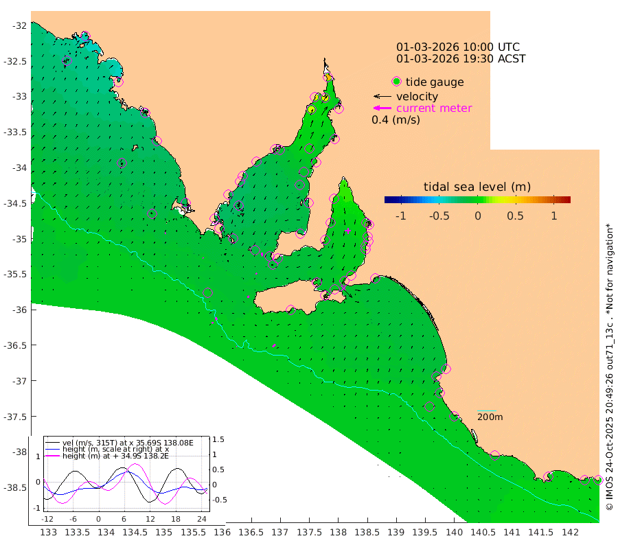 1cm/s 105T +10cm/s rms + 5cm/s 114T. SAM1DS 520m 1cm/s -42T +13cm/s rms + 5cm/s -36T. SAM2CP 100m 6cm/s -22T +21cm/s rms + 18cm/s 142T. SAM3MS 168m 8cm/s 44T +22cm/s rms + 0cm/s -30T. SAM4CY 117m 1cm/s 59T +23cm/s rms + 2cm/s 99T. SAM5CB 94m 3cm/s -61T +8cm/s rms + 3cm/s -172T. SAM6IS 83m 3cm/s -24T +11cm/s rms + 7cm/s 150T. SAM7DS 519m 8cm/s -12T +10cm/s rms + 2cm/s 87T. SAM8SG 47m 4cm/s -7T +20cm/s rms + 12cm/s -168T. NRSKAI 101m -3cm Warrnambool -5cm Port Fairy -4cm Portland -11cm Port Macdonnell -4cm Beachport -7cm Cape Rabelais (off) -9cm Robe -13cm Cape Jaffa -11cm Kingston -8cm Victor Harbor -4cm Vivonne Bay -4cm Kingscote -3cm American River -5cm Penneshaw -1cm Cape Jervis 5cm Second Valley 2cm Port Noarlunga 3cm Port Stanvac 4cm Brighton 2cm Glenelg 7cm Port Adelaide (Outer Harbor) 21cm Angus Inlet (Garden Island) 6cm Ardrossan -11cm Port Vincent -4cm Port Giles -16cm Stenhouse Bay -14cm Althorpe Island -17cm Pondalowie Bay -21cm Point Turton -22cm Port Victoria -15cm Cape Elizabeth -10cm Tiparra Reef Light -1cm Wallaroo 6cm Middle Bank -18cm Port Broughton 40cm Port Pirie 60cm Red Cliff Point (Beacon 5) 41cm Port Bonython 38cm Whyalla 30cm Western Shoal Beacon -4cm Franklin Harbor -8cm Franklin Harbor Entrance Beacon -15cm Arno Bay -18cm Port Neill -19cm Cape Hardy -20cm Tumby Bay -21cm Reevesby Island -21cm Port Lincoln -17cm Taylors Landing -20cm Whalers Bay -16cm Wedge Island Mooring -7cm Shelf Edge Mooring -20cm Coffin Bay Entrance Beacon -12cm Greenly Island -22cm Elliston -21cm Pearson Island -23cm Venus Bay -41cm Blanche Port (Streaky Bay) -38cm Thevenard -28cm St Francis Island