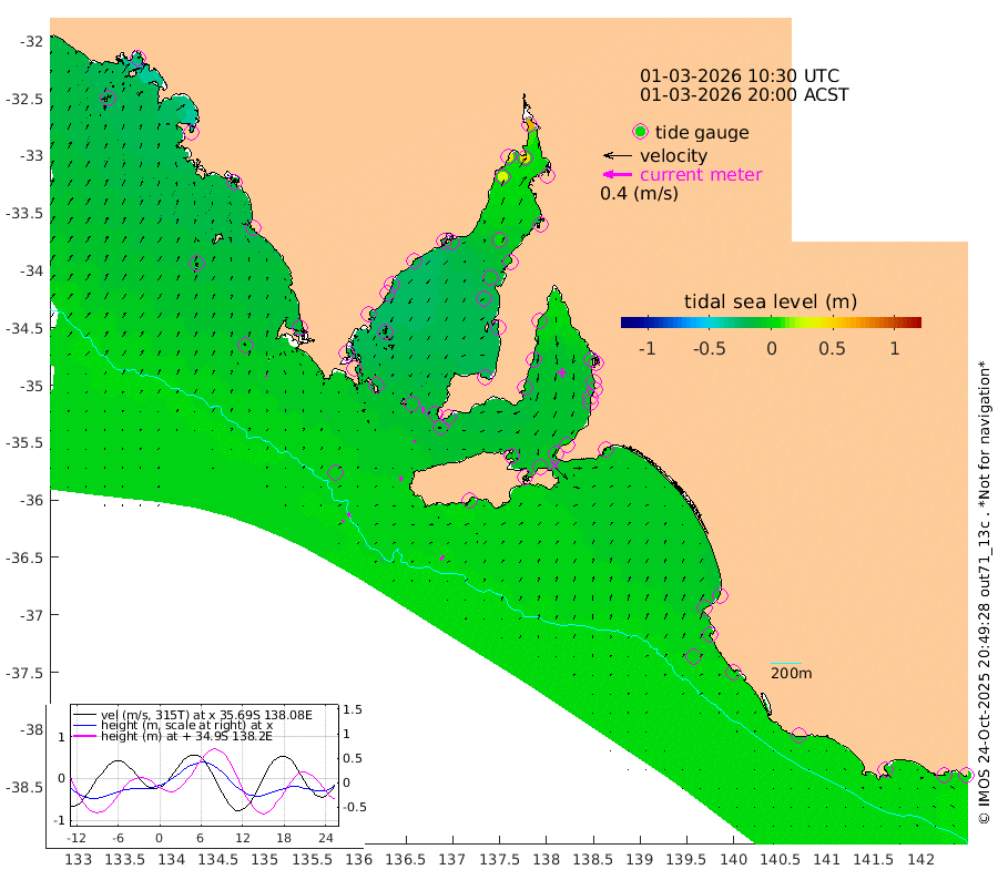 1cm/s 105T +10cm/s rms + 5cm/s 114T. SAM1DS 520m 2cm/s -12T +13cm/s rms + 5cm/s -36T. SAM2CP 100m 6cm/s -25T +21cm/s rms + 18cm/s 142T. SAM3MS 168m 8cm/s 34T +22cm/s rms + 0cm/s -30T. SAM4CY 117m 2cm/s 32T +23cm/s rms + 2cm/s 99T. SAM5CB 94m 3cm/s -36T +8cm/s rms + 3cm/s -172T. SAM6IS 83m 3cm/s -29T +11cm/s rms + 7cm/s 150T. SAM7DS 519m 9cm/s -7T +10cm/s rms + 2cm/s 87T. SAM8SG 47m 5cm/s -3T +20cm/s rms + 12cm/s -168T. NRSKAI 101m 2cm Warrnambool 1cm Port Fairy 2cm Portland -6cm Port Macdonnell 2cm Beachport 0cm Cape Rabelais (off) -3cm Robe -6cm Cape Jaffa -4cm Kingston -2cm Victor Harbor 2cm Vivonne Bay -6cm Kingscote -4cm American River -5cm Penneshaw -2cm Cape Jervis 1cm Second Valley -5cm Port Noarlunga -5cm Port Stanvac -3cm Brighton -6cm Glenelg -3cm Port Adelaide (Outer Harbor) 11cm Angus Inlet (Garden Island) -7cm Ardrossan -19cm Port Vincent -11cm Port Giles -13cm Stenhouse Bay -10cm Althorpe Island -13cm Pondalowie Bay -20cm Point Turton -21cm Port Victoria -15cm Cape Elizabeth -10cm Tiparra Reef Light 0cm Wallaroo 7cm Middle Bank -12cm Port Broughton 47cm Port Pirie 66cm Red Cliff Point (Beacon 5) 45cm Port Bonython 42cm Whyalla 33cm Western Shoal Beacon -5cm Franklin Harbor -10cm Franklin Harbor Entrance Beacon -16cm Arno Bay -19cm Port Neill -18cm Cape Hardy -18cm Tumby Bay -19cm Reevesby Island -18cm Port Lincoln -11cm Taylors Landing -18cm Whalers Bay -11cm Wedge Island Mooring -1cm Shelf Edge Mooring -12cm Coffin Bay Entrance Beacon -5cm Greenly Island -13cm Elliston -13cm Pearson Island -18cm Venus Bay -31cm Blanche Port (Streaky Bay) -28cm Thevenard -19cm St Francis Island