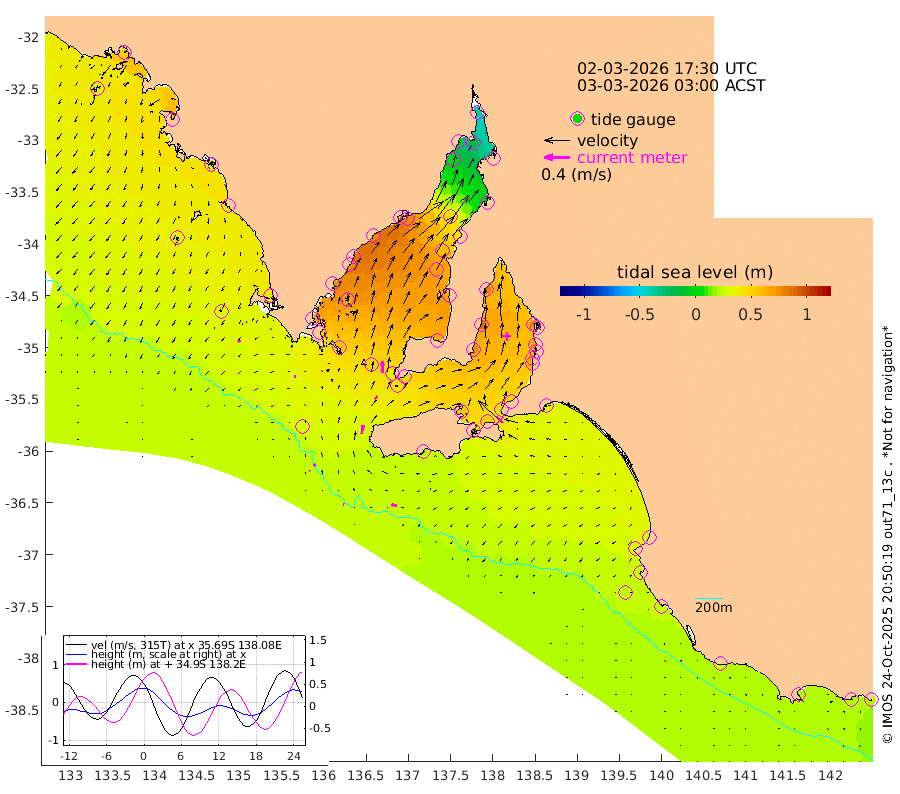 1cm/s -63T +10cm/s rms + 5cm/s 114T. SAM1DS 520m 3cm/s -96T +13cm/s rms + 5cm/s -36T. SAM2CP 100m 5cm/s -38T +21cm/s rms + 18cm/s 142T. SAM3MS 168m 8cm/s -77T +22cm/s rms + 0cm/s -30T. SAM4CY 117m 4cm/s -142T +23cm/s rms + 2cm/s 99T. SAM5CB 94m 6cm/s 46T +8cm/s rms + 3cm/s -172T. SAM6IS 83m 1cm/s -24T +11cm/s rms + 7cm/s 150T. SAM7DS 519m 18cm/s 1T +10cm/s rms + 2cm/s 87T. SAM8SG 47m 13cm/s 9T +20cm/s rms + 12cm/s -168T. NRSKAI 101m 21cm Warrnambool 22cm Port Fairy 22cm Portland 30cm Port Macdonnell 23cm Beachport 25cm Cape Rabelais (off) 26cm Robe 32cm Cape Jaffa 29cm Kingston 32cm Victor Harbor 20cm Vivonne Bay 55cm Kingscote 48cm American River 53cm Penneshaw 46cm Cape Jervis 50cm Second Valley 63cm Port Noarlunga 66cm Port Stanvac 63cm Brighton 69cm Glenelg 69cm Port Adelaide (Outer Harbor) 43cm Angus Inlet (Garden Island) 82cm Ardrossan 90cm Port Vincent 76cm Port Giles 46cm Stenhouse Bay 44cm Althorpe Island 41cm Pondalowie Bay 64cm Point Turton 67cm Port Victoria 68cm Cape Elizabeth 57cm Tiparra Reef Light 43cm Wallaroo 45cm Middle Bank 2cm Port Broughton -29cm Port Pirie -38cm Red Cliff Point (Beacon 5) -15cm Port Bonython -6cm Whyalla 3cm Western Shoal Beacon 57cm Franklin Harbor 78cm Franklin Harbor Entrance Beacon 78cm Arno Bay 83cm Port Neill 76cm Cape Hardy 74cm Tumby Bay 67cm Reevesby Island 64cm Port Lincoln 50cm Taylors Landing 58cm Whalers Bay 48cm Wedge Island Mooring 27cm Shelf Edge Mooring 40cm Coffin Bay Entrance Beacon 28cm Greenly Island 39cm Elliston 32cm Pearson Island 37cm Venus Bay 57cm Blanche Port (Streaky Bay) 52cm Thevenard 31cm St Francis Island