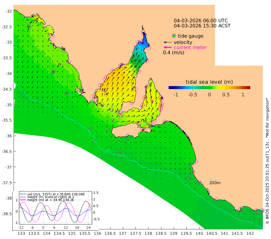 1cm/s 93T +10cm/s rms + 5cm/s 114T. SAM1DS 520m 1cm/s -1T +13cm/s rms + 5cm/s -36T. SAM2CP 100m 5cm/s 53T +21cm/s rms + 18cm/s 142T. SAM3MS 168m 6cm/s 127T +22cm/s rms + 0cm/s -30T. SAM4CY 117m 4cm/s -144T +23cm/s rms + 2cm/s 99T. SAM5CB 94m 9cm/s 54T +8cm/s rms + 3cm/s -172T. SAM6IS 83m 3cm/s 67T +11cm/s rms + 7cm/s 150T. SAM7DS 519m 12cm/s 42T +10cm/s rms + 2cm/s 87T. SAM8SG 47m 9cm/s 20T +20cm/s rms + 12cm/s -168T. NRSKAI 101m -10cm Warrnambool -8cm Port Fairy -8cm Portland -1cm Port Macdonnell -6cm Beachport -5cm Cape Rabelais (off) -2cm Robe -2cm Cape Jaffa -2cm Kingston 1cm Victor Harbor -2cm Vivonne Bay 26cm Kingscote 20cm American River 27cm Penneshaw 20cm Cape Jervis 22cm Second Valley 39cm Port Noarlunga 41cm Port Stanvac 38cm Brighton 43cm Glenelg 45cm Port Adelaide (Outer Harbor) 14cm Angus Inlet (Garden Island) 62cm Ardrossan 65cm Port Vincent 54cm Port Giles 22cm Stenhouse Bay 16cm Althorpe Island 15cm Pondalowie Bay 29cm Point Turton 30cm Port Victoria 25cm Cape Elizabeth 18cm Tiparra Reef Light -7cm Wallaroo -10cm Middle Bank -44cm Port Broughton -104cm Port Pirie -120cm Red Cliff Point (Beacon 5) -89cm Port Bonython -78cm Whyalla -60cm Western Shoal Beacon 9cm Franklin Harbor 33cm Franklin Harbor Entrance Beacon 40cm Arno Bay 45cm Port Neill 42cm Cape Hardy 40cm Tumby Bay 38cm Reevesby Island 36cm Port Lincoln 21cm Taylors Landing 28cm Whalers Bay 17cm Wedge Island Mooring -1cm Shelf Edge Mooring 10cm Coffin Bay Entrance Beacon 3cm Greenly Island 10cm Elliston 6cm Pearson Island 14cm Venus Bay 26cm Blanche Port (Streaky Bay) 24cm Thevenard 12cm St Francis Island