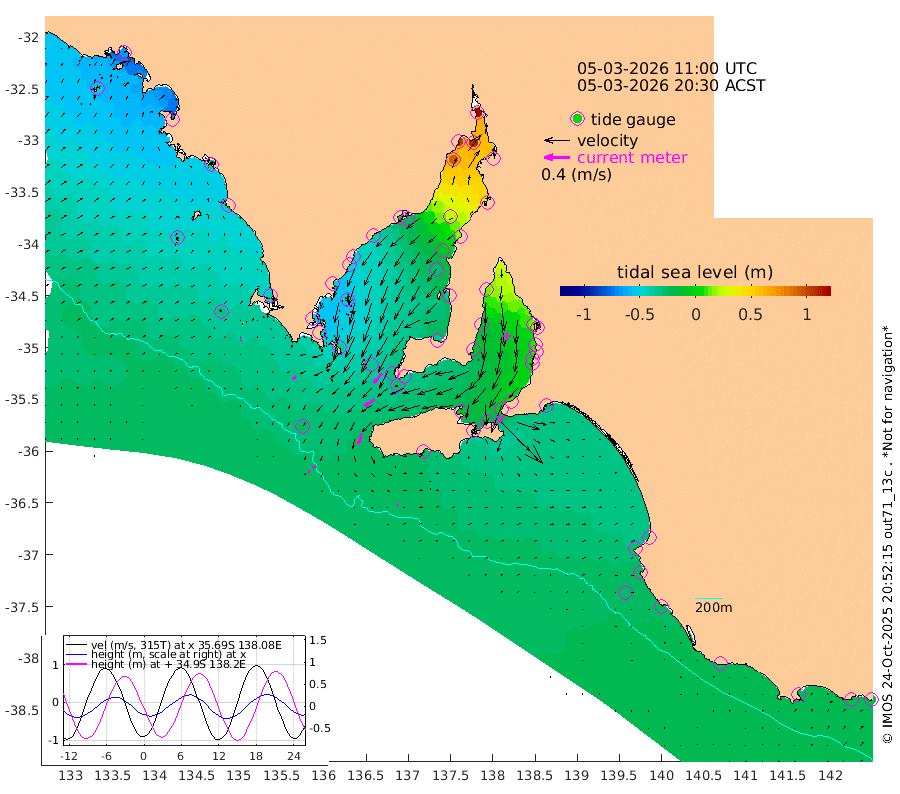 1cm/s -179T +10cm/s rms + 5cm/s 114T. SAM1DS 520m 6cm/s -129T +13cm/s rms + 5cm/s -36T. SAM2CP 100m 5cm/s -116T +21cm/s rms + 18cm/s 142T. SAM3MS 168m 3cm/s 34T +22cm/s rms + 0cm/s -30T. SAM4CY 117m 2cm/s 104T +23cm/s rms + 2cm/s 99T. SAM5CB 94m 18cm/s -124T +8cm/s rms + 3cm/s -172T. SAM6IS 83m 3cm/s -105T +11cm/s rms + 7cm/s 150T. SAM7DS 519m 19cm/s -138T +10cm/s rms + 2cm/s 87T. SAM8SG 47m 16cm/s -163T +20cm/s rms + 12cm/s -168T. NRSKAI 101m -20cm Warrnambool -21cm Port Fairy -21cm Portland -28cm Port Macdonnell -23cm Beachport -24cm Cape Rabelais (off) -26cm Robe -29cm Cape Jaffa -29cm Kingston -27cm Victor Harbor -24cm Vivonne Bay -10cm Kingscote -3cm American River -19cm Penneshaw -3cm Cape Jervis 8cm Second Valley 5cm Port Noarlunga 7cm Port Stanvac 11cm Brighton 8cm Glenelg 15cm Port Adelaide (Outer Harbor) 50cm Angus Inlet (Garden Island) 15cm Ardrossan -18cm Port Vincent -11cm Port Giles -35cm Stenhouse Bay -28cm Althorpe Island -31cm Pondalowie Bay -35cm Point Turton -34cm Port Victoria -28cm Cape Elizabeth -9cm Tiparra Reef Light 18cm Wallaroo 25cm Middle Bank 31cm Port Broughton 119cm Port Pirie 145cm Red Cliff Point (Beacon 5) 105cm Port Bonython 103cm Whyalla 91cm Western Shoal Beacon 4cm Franklin Harbor -24cm Franklin Harbor Entrance Beacon -38cm Arno Bay -49cm Port Neill -45cm Cape Hardy -49cm Tumby Bay -45cm Reevesby Island -52cm Port Lincoln -46cm Taylors Landing -34cm Whalers Bay -37cm Wedge Island Mooring -26cm Shelf Edge Mooring -42cm Coffin Bay Entrance Beacon -33cm Greenly Island -43cm Elliston -43cm Pearson Island -38cm Venus Bay -70cm Blanche Port (Streaky Bay) -67cm Thevenard -49cm St Francis Island