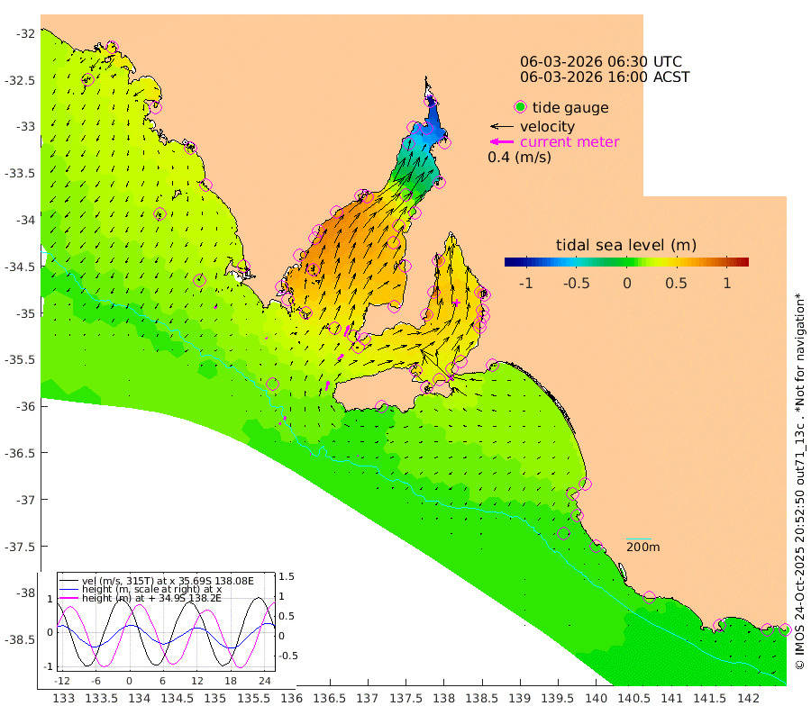 1cm/s 87T +10cm/s rms + 5cm/s 114T. SAM1DS 520m 2cm/s -30T +13cm/s rms + 5cm/s -36T. SAM2CP 100m 6cm/s 18T +21cm/s rms + 18cm/s 142T. SAM3MS 168m 1cm/s 149T +22cm/s rms + 0cm/s -30T. SAM4CY 117m 4cm/s -137T +23cm/s rms + 2cm/s 99T. SAM5CB 94m 13cm/s 49T +8cm/s rms + 3cm/s -172T. SAM6IS 83m 3cm/s 41T +11cm/s rms + 7cm/s 150T. SAM7DS 519m 20cm/s 23T +10cm/s rms + 2cm/s 87T. SAM8SG 47m 16cm/s 15T +20cm/s rms + 12cm/s -168T. NRSKAI 101m 8cm Warrnambool 9cm Port Fairy 10cm Portland 16cm Port Macdonnell 11cm Beachport 11cm Cape Rabelais (off) 14cm Robe 16cm Cape Jaffa 14cm Kingston 19cm Victor Harbor 12cm Vivonne Bay 47cm Kingscote 38cm American River 47cm Penneshaw 37cm Cape Jervis 41cm Second Valley 58cm Port Noarlunga 61cm Port Stanvac 58cm Brighton 63cm Glenelg 66cm Port Adelaide (Outer Harbor) 30cm Angus Inlet (Garden Island) 84cm Ardrossan 90cm Port Vincent 76cm Port Giles 40cm Stenhouse Bay 34cm Althorpe Island 31cm Pondalowie Bay 52cm Point Turton 52cm Port Victoria 49cm Cape Elizabeth 39cm Tiparra Reef Light 14cm Wallaroo 13cm Middle Bank -40cm Port Broughton -91cm Port Pirie -109cm Red Cliff Point (Beacon 5) -74cm Port Bonython -60cm Whyalla -44cm Western Shoal Beacon 34cm Franklin Harbor 61cm Franklin Harbor Entrance Beacon 66cm Arno Bay 72cm Port Neill 66cm Cape Hardy 63cm Tumby Bay 60cm Reevesby Island 59cm Port Lincoln 41cm Taylors Landing 48cm Whalers Bay 36cm Wedge Island Mooring 15cm Shelf Edge Mooring 26cm Coffin Bay Entrance Beacon 18cm Greenly Island 26cm Elliston 19cm Pearson Island 27cm Venus Bay 43cm Blanche Port (Streaky Bay) 40cm Thevenard 25cm St Francis Island