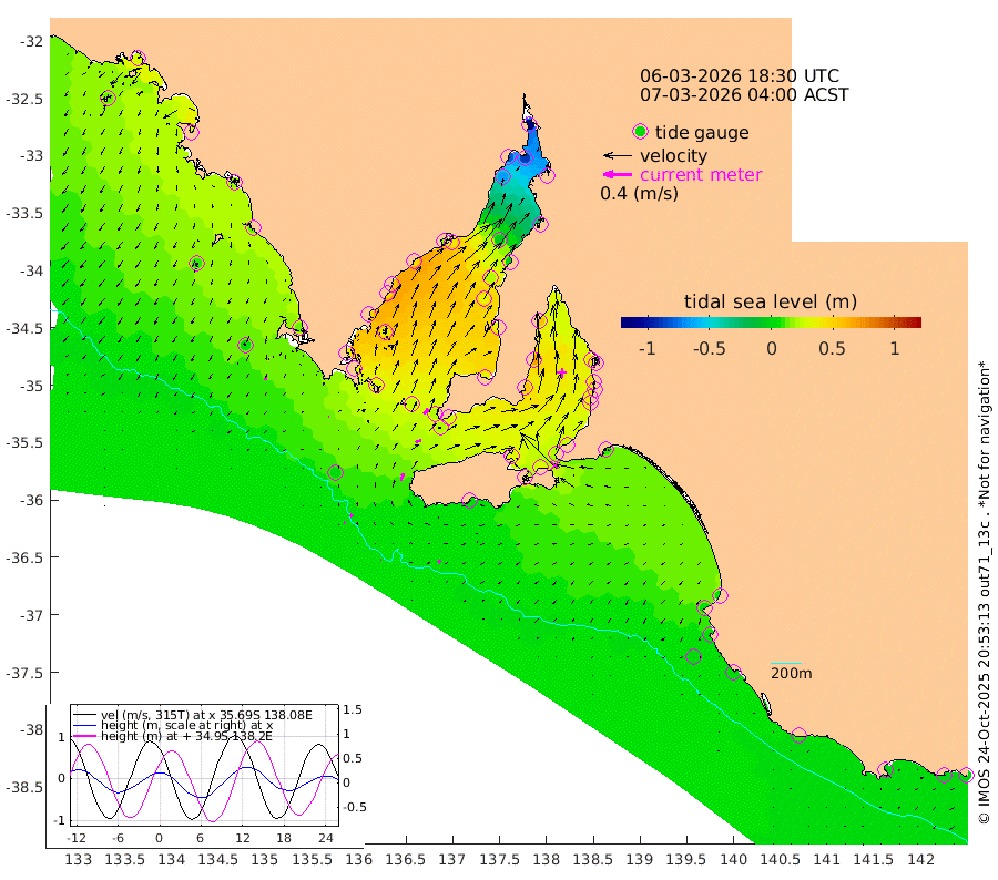 1cm/s -50T +10cm/s rms + 5cm/s 114T. SAM1DS 520m 0cm/s 64T +13cm/s rms + 5cm/s -36T. SAM2CP 100m 4cm/s 48T +21cm/s rms + 18cm/s 142T. SAM3MS 168m 4cm/s -138T +22cm/s rms + 0cm/s -30T. SAM4CY 117m 4cm/s -157T +23cm/s rms + 2cm/s 99T. SAM5CB 94m 9cm/s 68T +8cm/s rms + 3cm/s -172T. SAM6IS 83m 2cm/s 65T +11cm/s rms + 7cm/s 150T. SAM7DS 519m 9cm/s 43T +10cm/s rms + 2cm/s 87T. SAM8SG 47m 10cm/s 16T +20cm/s rms + 12cm/s -168T. NRSKAI 101m -1cm Warrnambool 0cm Port Fairy 0cm Portland 8cm Port Macdonnell 0cm Beachport 3cm Cape Rabelais (off) 4cm Robe 7cm Cape Jaffa 7cm Kingston 8cm Victor Harbor 1cm Vivonne Bay 30cm Kingscote 23cm American River 30cm Penneshaw 21cm Cape Jervis 24cm Second Valley 38cm Port Noarlunga 40cm Port Stanvac 38cm Brighton 43cm Glenelg 43cm Port Adelaide (Outer Harbor) 7cm Angus Inlet (Garden Island) 58cm Ardrossan 68cm Port Vincent 55cm Port Giles 28cm Stenhouse Bay 22cm Althorpe Island 21cm Pondalowie Bay 37cm Point Turton 37cm Port Victoria 36cm Cape Elizabeth 22cm Tiparra Reef Light -3cm Wallaroo -6cm Middle Bank -26cm Port Broughton -107cm Port Pirie -118cm Red Cliff Point (Beacon 5) -89cm Port Bonython -80cm Whyalla -65cm Western Shoal Beacon 15cm Franklin Harbor 38cm Franklin Harbor Entrance Beacon 46cm Arno Bay 56cm Port Neill 50cm Cape Hardy 49cm Tumby Bay 38cm Reevesby Island 40cm Port Lincoln 27cm Taylors Landing 33cm Whalers Bay 23cm Wedge Island Mooring 3cm Shelf Edge Mooring 15cm Coffin Bay Entrance Beacon 5cm Greenly Island 14cm Elliston 11cm Pearson Island 18cm Venus Bay 31cm Blanche Port (Streaky Bay) 26cm Thevenard 15cm St Francis Island