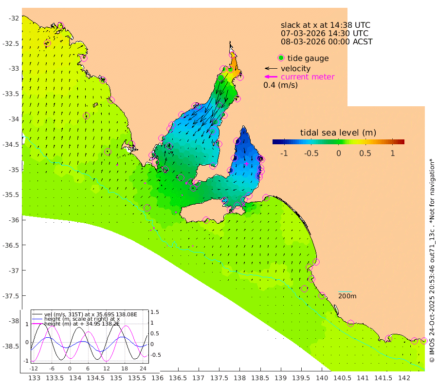 1cm/s -84T +10cm/s rms + 5cm/s 114T. SAM1DS 520m 5cm/s 77T +13cm/s rms + 5cm/s -36T. SAM2CP 100m 5cm/s 163T +21cm/s rms + 18cm/s 142T. SAM3MS 168m 4cm/s -50T +22cm/s rms + 0cm/s -30T. SAM4CY 117m 5cm/s 21T +23cm/s rms + 2cm/s 99T. SAM5CB 94m 3cm/s -164T +8cm/s rms + 3cm/s -172T. SAM6IS 83m 2cm/s -170T +11cm/s rms + 7cm/s 150T. SAM7DS 519m 7cm/s 169T +10cm/s rms + 2cm/s 87T. SAM8SG 47m 4cm/s -173T +20cm/s rms + 12cm/s -168T. NRSKAI 101m 22cm Warrnambool 20cm Port Fairy 21cm Portland 15cm Port Macdonnell 17cm Beachport 19cm Cape Rabelais (off) 18cm Robe 20cm Cape Jaffa 20cm Kingston 13cm Victor Harbor 17cm Vivonne Bay -53cm Kingscote -41cm American River -37cm Penneshaw -39cm Cape Jervis -59cm Second Valley -86cm Port Noarlunga -89cm Port Stanvac -90cm Brighton -94cm Glenelg -105cm Port Adelaide (Outer Harbor) -92cm Angus Inlet (Garden Island) -132cm Ardrossan -115cm Port Vincent -92cm Port Giles -13cm Stenhouse Bay -5cm Althorpe Island -5cm Pondalowie Bay -28cm Point Turton -30cm Port Victoria -34cm Cape Elizabeth -24cm Tiparra Reef Light -18cm Wallaroo -24cm Middle Bank 36cm Port Broughton 39cm Port Pirie 42cm Red Cliff Point (Beacon 5) 11cm Port Bonython 7cm Whyalla 6cm Western Shoal Beacon -38cm Franklin Harbor -46cm Franklin Harbor Entrance Beacon -41cm Arno Bay -42cm Port Neill -32cm Cape Hardy -26cm Tumby Bay -22cm Reevesby Island -16cm Port Lincoln -3cm Taylors Landing -19cm Whalers Bay -4cm Wedge Island Mooring 14cm Shelf Edge Mooring 17cm Coffin Bay Entrance Beacon 17cm Greenly Island 21cm Elliston 21cm Pearson Island 12cm Venus Bay 25cm Blanche Port (Streaky Bay) 27cm Thevenard 37cm St Francis Island