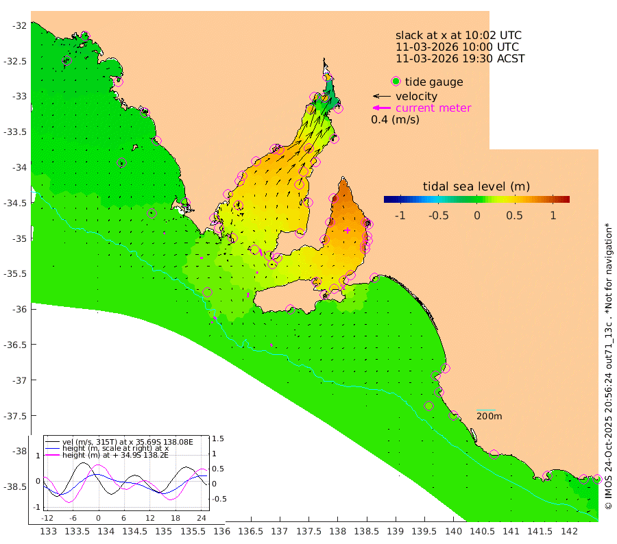0cm/s 142T +10cm/s rms + 5cm/s 114T. SAM1DS 520m 6cm/s -98T +13cm/s rms + 5cm/s -36T. SAM2CP 100m 8cm/s -40T +21cm/s rms + 18cm/s 142T. SAM3MS 168m 6cm/s -33T +22cm/s rms + 0cm/s -30T. SAM4CY 117m 3cm/s -131T +23cm/s rms + 2cm/s 99T. SAM5CB 94m 4cm/s 18T +8cm/s rms + 3cm/s -172T. SAM6IS 83m 4cm/s -30T +11cm/s rms + 7cm/s 150T. SAM7DS 519m 16cm/s -19T +10cm/s rms + 2cm/s 87T. SAM8SG 47m 9cm/s 2T +20cm/s rms + 12cm/s -168T. NRSKAI 101m 9cm Warrnambool 9cm Port Fairy 11cm Portland 11cm Port Macdonnell 13cm Beachport 12cm Cape Rabelais (off) 11cm Robe 11cm Cape Jaffa 11cm Kingston 18cm Victor Harbor 10cm Vivonne Bay 60cm Kingscote 54cm American River 50cm Penneshaw 50cm Cape Jervis 66cm Second Valley 79cm Port Noarlunga 83cm Port Stanvac 85cm Brighton 86cm Glenelg 94cm Port Adelaide (Outer Harbor) 91cm Angus Inlet (Garden Island) 110cm Ardrossan 100cm Port Vincent 82cm Port Giles 27cm Stenhouse Bay 29cm Althorpe Island 22cm Pondalowie Bay 40cm Point Turton 39cm Port Victoria 48cm Cape Elizabeth 49cm Tiparra Reef Light 52cm Wallaroo 60cm Middle Bank 3cm Port Broughton 47cm Port Pirie 56cm Red Cliff Point (Beacon 5) 62cm Port Bonython 64cm Whyalla 60cm Western Shoal Beacon 58cm Franklin Harbor 62cm Franklin Harbor Entrance Beacon 54cm Arno Bay 56cm Port Neill 46cm Cape Hardy 41cm Tumby Bay 38cm Reevesby Island 32cm Port Lincoln 24cm Taylors Landing 34cm Whalers Bay 26cm Wedge Island Mooring 15cm Shelf Edge Mooring 12cm Coffin Bay Entrance Beacon 9cm Greenly Island 7cm Elliston 6cm Pearson Island 9cm Venus Bay 3cm Blanche Port (Streaky Bay) 1cm Thevenard -1cm St Francis Island