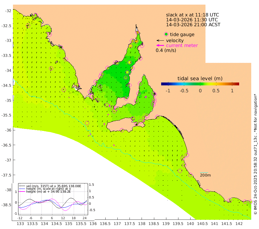 0cm/s -52T +10cm/s rms + 5cm/s 114T. SAM1DS 520m 2cm/s -43T +13cm/s rms + 5cm/s -36T. SAM2CP 100m 5cm/s -37T +21cm/s rms + 18cm/s 142T. SAM3MS 168m 8cm/s -24T +22cm/s rms + 0cm/s -30T. SAM4CY 117m 3cm/s -13T +23cm/s rms + 2cm/s 99T. SAM5CB 94m 6cm/s 29T +8cm/s rms + 3cm/s -172T. SAM6IS 83m 3cm/s -42T +11cm/s rms + 7cm/s 150T. SAM7DS 519m 15cm/s -7T +10cm/s rms + 2cm/s 87T. SAM8SG 47m 10cm/s 4T +20cm/s rms + 12cm/s -168T. NRSKAI 101m 20cm Warrnambool 20cm Port Fairy 22cm Portland 19cm Port Macdonnell 24cm Beachport 25cm Cape Rabelais (off) 22cm Robe 22cm Cape Jaffa 23cm Kingston 26cm Victor Harbor 25cm Vivonne Bay 19cm Kingscote 21cm American River 21cm Penneshaw 20cm Cape Jervis 20cm Second Valley 14cm Port Noarlunga 14cm Port Stanvac 17cm Brighton 16cm Glenelg 14cm Port Adelaide (Outer Harbor) 20cm Angus Inlet (Garden Island) 12cm Ardrossan 14cm Port Vincent 12cm Port Giles 17cm Stenhouse Bay 23cm Althorpe Island 17cm Pondalowie Bay 12cm Point Turton 12cm Port Victoria 15cm Cape Elizabeth 21cm Tiparra Reef Light 26cm Wallaroo 30cm Middle Bank 17cm Port Broughton 56cm Port Pirie 64cm Red Cliff Point (Beacon 5) 57cm Port Bonython 52cm Whyalla 46cm Western Shoal Beacon 14cm Franklin Harbor 20cm Franklin Harbor Entrance Beacon 19cm Arno Bay 22cm Port Neill 21cm Cape Hardy 21cm Tumby Bay 18cm Reevesby Island 20cm Port Lincoln 22cm Taylors Landing 17cm Whalers Bay 22cm Wedge Island Mooring 26cm Shelf Edge Mooring 24cm Coffin Bay Entrance Beacon 24cm Greenly Island 24cm Elliston 27cm Pearson Island 16cm Venus Bay 23cm Blanche Port (Streaky Bay) 22cm Thevenard 28cm St Francis Island