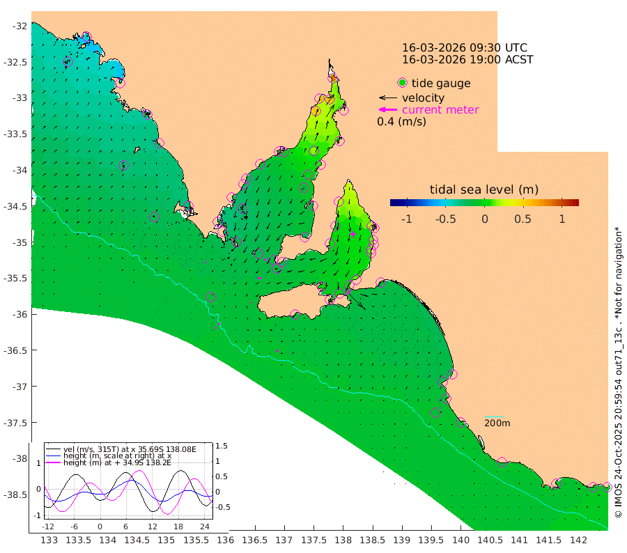 0cm/s 87T +10cm/s rms + 5cm/s 114T. SAM1DS 520m 3cm/s -101T +13cm/s rms + 5cm/s -36T. SAM2CP 100m 4cm/s -47T +21cm/s rms + 18cm/s 142T. SAM3MS 168m 6cm/s 34T +22cm/s rms + 0cm/s -30T. SAM4CY 117m 1cm/s 92T +23cm/s rms + 2cm/s 99T. SAM5CB 94m 6cm/s -98T +8cm/s rms + 3cm/s -172T. SAM6IS 83m 3cm/s -42T +11cm/s rms + 7cm/s 150T. SAM7DS 519m 6cm/s -68T +10cm/s rms + 2cm/s 87T. SAM8SG 47m 2cm/s -121T +20cm/s rms + 12cm/s -168T. NRSKAI 101m -8cm Warrnambool -9cm Port Fairy -9cm Portland -14cm Port Macdonnell -9cm Beachport -12cm Cape Rabelais (off) -13cm Robe -15cm Cape Jaffa -16cm Kingston -12cm Victor Harbor -10cm Vivonne Bay 1cm Kingscote 1cm American River -3cm Penneshaw 4cm Cape Jervis 14cm Second Valley 11cm Port Noarlunga 13cm Port Stanvac 15cm Brighton 14cm Glenelg 19cm Port Adelaide (Outer Harbor) 38cm Angus Inlet (Garden Island) 21cm Ardrossan -8cm Port Vincent 4cm Port Giles -17cm Stenhouse Bay -15cm Althorpe Island -18cm Pondalowie Bay -19cm Point Turton -18cm Port Victoria -14cm Cape Elizabeth -4cm Tiparra Reef Light 11cm Wallaroo 18cm Middle Bank -1cm Port Broughton 65cm Port Pirie 83cm Red Cliff Point (Beacon 5) 58cm Port Bonython 61cm Whyalla 53cm Western Shoal Beacon 4cm Franklin Harbor -5cm Franklin Harbor Entrance Beacon -15cm Arno Bay -22cm Port Neill -20cm Cape Hardy -22cm Tumby Bay -25cm Reevesby Island -26cm Port Lincoln -23cm Taylors Landing -18cm Whalers Bay -19cm Wedge Island Mooring -12cm Shelf Edge Mooring -26cm Coffin Bay Entrance Beacon -17cm Greenly Island -26cm Elliston -28cm Pearson Island -27cm Venus Bay -50cm Blanche Port (Streaky Bay) -47cm Thevenard -38cm St Francis Island