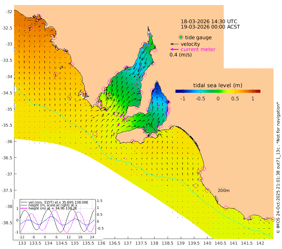 1cm/s -59T +10cm/s rms + 5cm/s 114T. SAM1DS 520m 9cm/s 54T +13cm/s rms + 5cm/s -36T. SAM2CP 100m 4cm/s 62T +21cm/s rms + 18cm/s 142T. SAM3MS 168m 5cm/s -26T +22cm/s rms + 0cm/s -30T. SAM4CY 117m 6cm/s 1T +23cm/s rms + 2cm/s 99T. SAM5CB 94m 14cm/s 50T +8cm/s rms + 3cm/s -172T. SAM6IS 83m 1cm/s 58T +11cm/s rms + 7cm/s 150T. SAM7DS 519m 20cm/s 36T +10cm/s rms + 2cm/s 87T. SAM8SG 47m 16cm/s 15T +20cm/s rms + 12cm/s -168T. NRSKAI 101m 30cm Warrnambool 30cm Port Fairy 33cm Portland 32cm Port Macdonnell 34cm Beachport 37cm Cape Rabelais (off) 35cm Robe 40cm Cape Jaffa 39cm Kingston 36cm Victor Harbor 39cm Vivonne Bay -29cm Kingscote -23cm American River -8cm Penneshaw -21cm Cape Jervis -43cm Second Valley -65cm Port Noarlunga -68cm Port Stanvac -70cm Brighton -71cm Glenelg -86cm Port Adelaide (Outer Harbor) -100cm Angus Inlet (Garden Island) -107cm Ardrossan -70cm Port Vincent -59cm Port Giles 19cm Stenhouse Bay 22cm Althorpe Island 21cm Pondalowie Bay -1cm Point Turton 0cm Port Victoria -6cm Cape Elizabeth -13cm Tiparra Reef Light -27cm Wallaroo -34cm Middle Bank -2cm Port Broughton -48cm Port Pirie -56cm Red Cliff Point (Beacon 5) -61cm Port Bonython -60cm Whyalla -52cm Western Shoal Beacon -35cm Franklin Harbor -15cm Franklin Harbor Entrance Beacon -1cm Arno Bay 7cm Port Neill 14cm Cape Hardy 23cm Tumby Bay 19cm Reevesby Island 31cm Port Lincoln 38cm Taylors Landing 12cm Whalers Bay 29cm Wedge Island Mooring 38cm Shelf Edge Mooring 50cm Coffin Bay Entrance Beacon 45cm Greenly Island 57cm Elliston 55cm Pearson Island 39cm Venus Bay 76cm Blanche Port (Streaky Bay) 76cm Thevenard 69cm St Francis Island