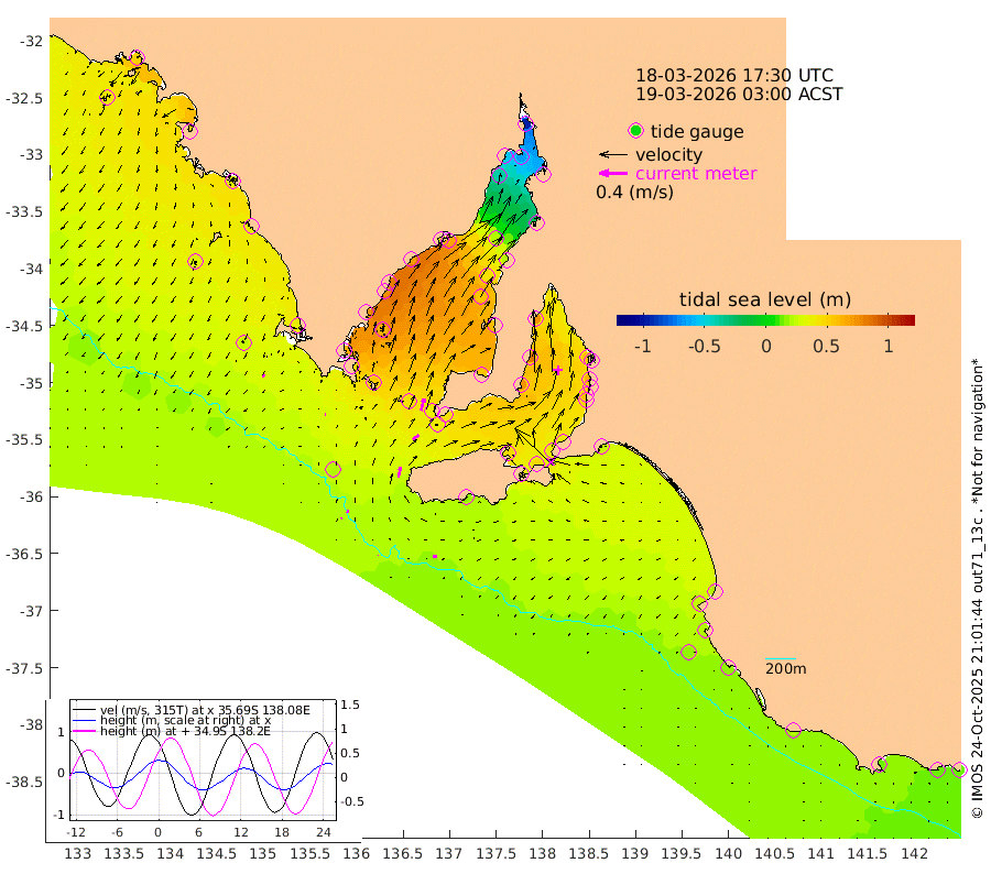 1cm/s -44T +10cm/s rms + 5cm/s 114T. SAM1DS 520m 1cm/s -88T +13cm/s rms + 5cm/s -36T. SAM2CP 100m 5cm/s 12T +21cm/s rms + 18cm/s 142T. SAM3MS 168m 5cm/s -89T +22cm/s rms + 0cm/s -30T. SAM4CY 117m 4cm/s -147T +23cm/s rms + 2cm/s 99T. SAM5CB 94m 10cm/s 55T +8cm/s rms + 3cm/s -172T. SAM6IS 83m 2cm/s 34T +11cm/s rms + 7cm/s 150T. SAM7DS 519m 18cm/s 15T +10cm/s rms + 2cm/s 87T. SAM8SG 47m 15cm/s 13T +20cm/s rms + 12cm/s -168T. NRSKAI 101m 13cm Warrnambool 14cm Port Fairy 15cm Portland 22cm Port Macdonnell 15cm Beachport 18cm Cape Rabelais (off) 19cm Robe 24cm Cape Jaffa 21cm Kingston 25cm Victor Harbor 15cm Vivonne Bay 47cm Kingscote 40cm American River 48cm Penneshaw 38cm Cape Jervis 40cm Second Valley 54cm Port Noarlunga 57cm Port Stanvac 55cm Brighton 60cm Glenelg 59cm Port Adelaide (Outer Harbor) 24cm Angus Inlet (Garden Island) 75cm Ardrossan 84cm Port Vincent 71cm Port Giles 44cm Stenhouse Bay 41cm Althorpe Island 36cm Pondalowie Bay 55cm Point Turton 59cm Port Victoria 56cm Cape Elizabeth 43cm Tiparra Reef Light 20cm Wallaroo 19cm Middle Bank -19cm Port Broughton -83cm Port Pirie -95cm Red Cliff Point (Beacon 5) -65cm Port Bonython -55cm Whyalla -40cm Western Shoal Beacon 34cm Franklin Harbor 64cm Franklin Harbor Entrance Beacon 70cm Arno Bay 80cm Port Neill 73cm Cape Hardy 72cm Tumby Bay 61cm Reevesby Island 63cm Port Lincoln 47cm Taylors Landing 54cm Whalers Bay 42cm Wedge Island Mooring 20cm Shelf Edge Mooring 34cm Coffin Bay Entrance Beacon 23cm Greenly Island 35cm Elliston 30cm Pearson Island 34cm Venus Bay 56cm Blanche Port (Streaky Bay) 51cm Thevenard 39cm St Francis Island