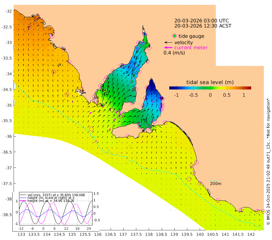 0cm/s 42T +10cm/s rms + 5cm/s 114T. SAM1DS 520m 11cm/s 54T +13cm/s rms + 5cm/s -36T. SAM2CP 100m 6cm/s 97T +21cm/s rms + 18cm/s 142T. SAM3MS 168m 2cm/s 108T +22cm/s rms + 0cm/s -30T. SAM4CY 117m 7cm/s -6T +23cm/s rms + 2cm/s 99T. SAM5CB 94m 17cm/s 53T +8cm/s rms + 3cm/s -172T. SAM6IS 83m 2cm/s 94T +11cm/s rms + 7cm/s 150T. SAM7DS 519m 18cm/s 51T +10cm/s rms + 2cm/s 87T. SAM8SG 47m 14cm/s 20T +20cm/s rms + 12cm/s -168T. NRSKAI 101m 33cm Warrnambool 32cm Port Fairy 33cm Portland 33cm Port Macdonnell 34cm Beachport 36cm Cape Rabelais (off) 36cm Robe 35cm Cape Jaffa 37cm Kingston 32cm Victor Harbor 39cm Vivonne Bay -38cm Kingscote -34cm American River -18cm Penneshaw -33cm Cape Jervis -59cm Second Valley -77cm Port Noarlunga -82cm Port Stanvac -86cm Brighton -87cm Glenelg -102cm Port Adelaide (Outer Harbor) -112cm Angus Inlet (Garden Island) -124cm Ardrossan -84cm Port Vincent -72cm Port Giles 17cm Stenhouse Bay 15cm Althorpe Island 20cm Pondalowie Bay -2cm Point Turton -7cm Port Victoria -18cm Cape Elizabeth -19cm Tiparra Reef Light -36cm Wallaroo -47cm Middle Bank -10cm Port Broughton -63cm Port Pirie -88cm Red Cliff Point (Beacon 5) -66cm Port Bonython -76cm Whyalla -71cm Western Shoal Beacon -48cm Franklin Harbor -29cm Franklin Harbor Entrance Beacon -10cm Arno Bay 0cm Port Neill 4cm Cape Hardy 12cm Tumby Bay 17cm Reevesby Island 27cm Port Lincoln 35cm Taylors Landing 5cm Whalers Bay 25cm Wedge Island Mooring 37cm Shelf Edge Mooring 49cm Coffin Bay Entrance Beacon 43cm Greenly Island 51cm Elliston 56cm Pearson Island 38cm Venus Bay 74cm Blanche Port (Streaky Bay) 76cm Thevenard 69cm St Francis Island