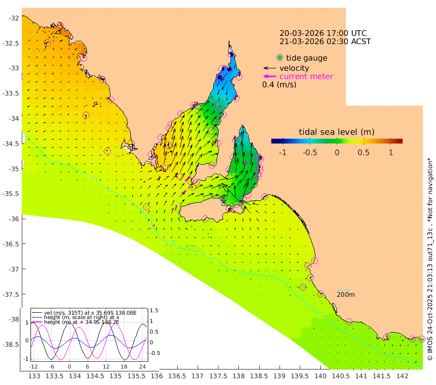 1cm/s -53T +10cm/s rms + 5cm/s 114T. SAM1DS 520m 7cm/s 57T +13cm/s rms + 5cm/s -36T. SAM2CP 100m 7cm/s 65T +21cm/s rms + 18cm/s 142T. SAM3MS 168m 2cm/s -127T +22cm/s rms + 0cm/s -30T. SAM4CY 117m 1cm/s -87T +23cm/s rms + 2cm/s 99T. SAM5CB 94m 17cm/s 58T +8cm/s rms + 3cm/s -172T. SAM6IS 83m 3cm/s 79T +11cm/s rms + 7cm/s 150T. SAM7DS 519m 19cm/s 47T +10cm/s rms + 2cm/s 87T. SAM8SG 47m 17cm/s 17T +20cm/s rms + 12cm/s -168T. NRSKAI 101m 12cm Warrnambool 12cm Port Fairy 14cm Portland 20cm Port Macdonnell 16cm Beachport 18cm Cape Rabelais (off) 20cm Robe 24cm Cape Jaffa 23cm Kingston 22cm Victor Harbor 19cm Vivonne Bay -2cm Kingscote -5cm American River 12cm Penneshaw -4cm Cape Jervis -16cm Second Valley -19cm Port Noarlunga -19cm Port Stanvac -21cm Brighton -18cm Glenelg -28cm Port Adelaide (Outer Harbor) -66cm Angus Inlet (Garden Island) -30cm Ardrossan 1cm Port Vincent 0cm Port Giles 29cm Stenhouse Bay 25cm Althorpe Island 25cm Pondalowie Bay 24cm Point Turton 26cm Port Victoria 18cm Cape Elizabeth 1cm Tiparra Reef Light -29cm Wallaroo -37cm Middle Bank -33cm Port Broughton -133cm Port Pirie -150cm Red Cliff Point (Beacon 5) -128cm Port Bonython -119cm Whyalla -101cm Western Shoal Beacon -16cm Franklin Harbor 16cm Franklin Harbor Entrance Beacon 30cm Arno Bay 41cm Port Neill 40cm Cape Hardy 45cm Tumby Bay 36cm Reevesby Island 46cm Port Lincoln 40cm Taylors Landing 29cm Whalers Bay 31cm Wedge Island Mooring 20cm Shelf Edge Mooring 38cm Coffin Bay Entrance Beacon 27cm Greenly Island 42cm Elliston 36cm Pearson Island 34cm Venus Bay 68cm Blanche Port (Streaky Bay) 66cm Thevenard 45cm St Francis Island