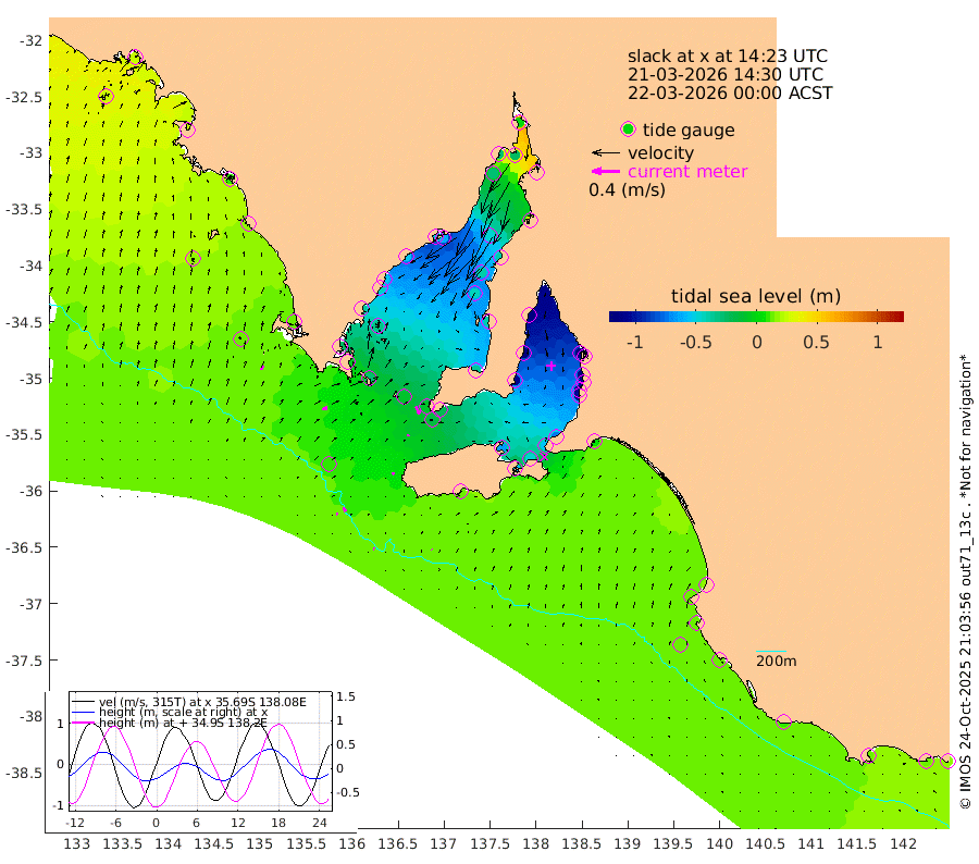 1cm/s -77T +10cm/s rms + 5cm/s 114T. SAM1DS 520m 7cm/s 72T +13cm/s rms + 5cm/s -36T. SAM2CP 100m 6cm/s 151T +21cm/s rms + 18cm/s 142T. SAM3MS 168m 1cm/s -34T +22cm/s rms + 0cm/s -30T. SAM4CY 117m 6cm/s 23T +23cm/s rms + 2cm/s 99T. SAM5CB 94m 2cm/s 155T +8cm/s rms + 3cm/s -172T. SAM6IS 83m 3cm/s 171T +11cm/s rms + 7cm/s 150T. SAM7DS 519m 12cm/s 153T +10cm/s rms + 2cm/s 87T. SAM8SG 47m 4cm/s 178T +20cm/s rms + 12cm/s -168T. NRSKAI 101m 15cm Warrnambool 14cm Port Fairy 14cm Portland 11cm Port Macdonnell 12cm Beachport 13cm Cape Rabelais (off) 13cm Robe 15cm Cape Jaffa 16cm Kingston 6cm Victor Harbor 12cm Vivonne Bay -66cm Kingscote -55cm American River -48cm Penneshaw -53cm Cape Jervis -75cm Second Valley -103cm Port Noarlunga -108cm Port Stanvac -110cm Brighton -114cm Glenelg -126cm Port Adelaide (Outer Harbor) -119cm Angus Inlet (Garden Island) -156cm Ardrossan -127cm Port Vincent -108cm Port Giles -19cm Stenhouse Bay -15cm Althorpe Island -10cm Pondalowie Bay -37cm Point Turton -39cm Port Victoria -41cm Cape Elizabeth -41cm Tiparra Reef Light -39cm Wallaroo -48cm Middle Bank 23cm Port Broughton 2cm Port Pirie 3cm Red Cliff Point (Beacon 5) -25cm Port Bonython -29cm Whyalla -29cm Western Shoal Beacon -52cm Franklin Harbor -61cm Franklin Harbor Entrance Beacon -54cm Arno Bay -54cm Port Neill -42cm Cape Hardy -35cm Tumby Bay -31cm Reevesby Island -23cm Port Lincoln -7cm Taylors Landing -29cm Whalers Bay -10cm Wedge Island Mooring 9cm Shelf Edge Mooring 13cm Coffin Bay Entrance Beacon 13cm Greenly Island 16cm Elliston 16cm Pearson Island 8cm Venus Bay 23cm Blanche Port (Streaky Bay) 25cm Thevenard 25cm St Francis Island